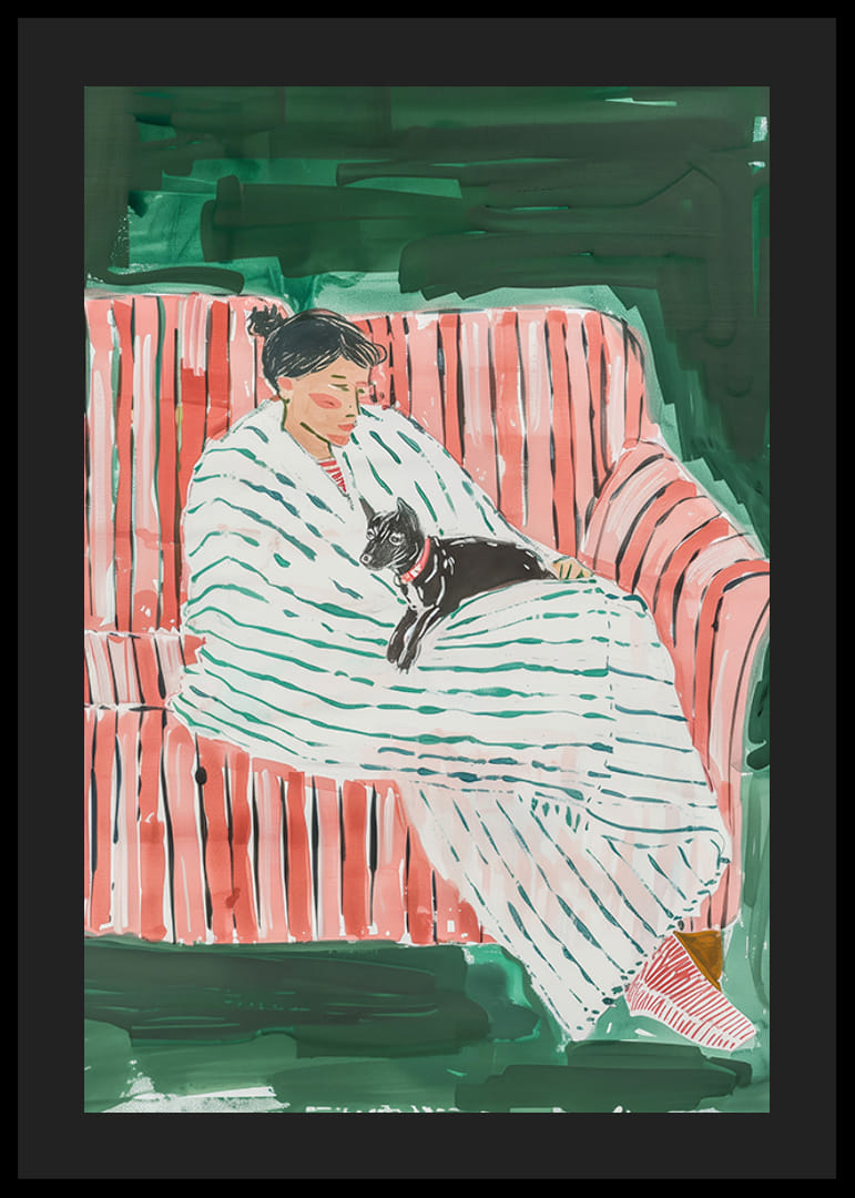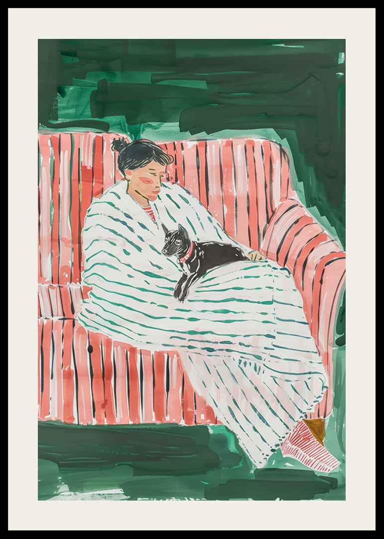 Denna charmiga illustration fångar en lugn stund av närhet och trygghet. En kvinna sitter insvept i en randig filt på en rosa soffa, med sin svarta katt bekvämt vilandes i knät. De mjuka färgtonerna och de avslappnade penseldragen skapar en känsla av ro och värme.