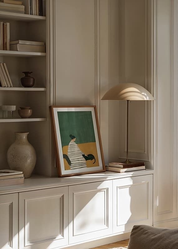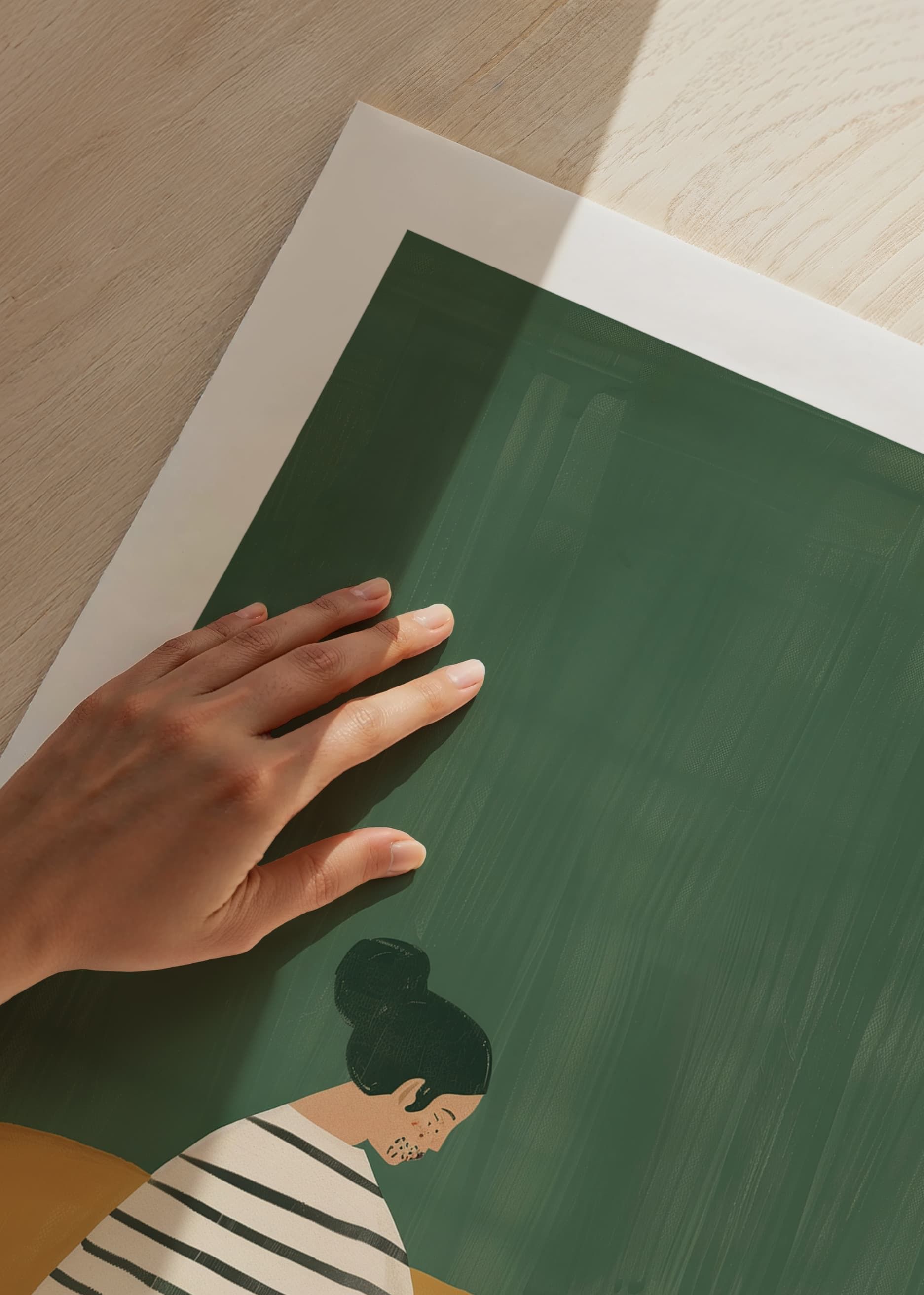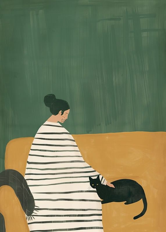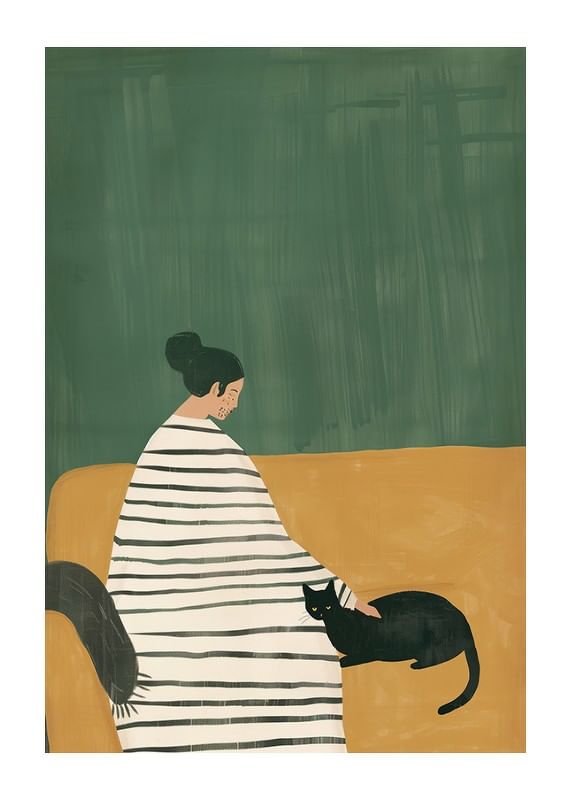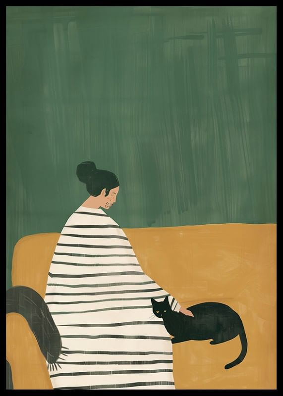 Denna vackra illustration fångar en ögonblick av lugn och närhet. En kvinna, insvept i en randig filt, sitter på en senapsgul soffa och delar en tyst stund med sin svarta katt. De mjuka färgtonerna och det minimalistiska uttrycket skapar en känsla av värme och ro.