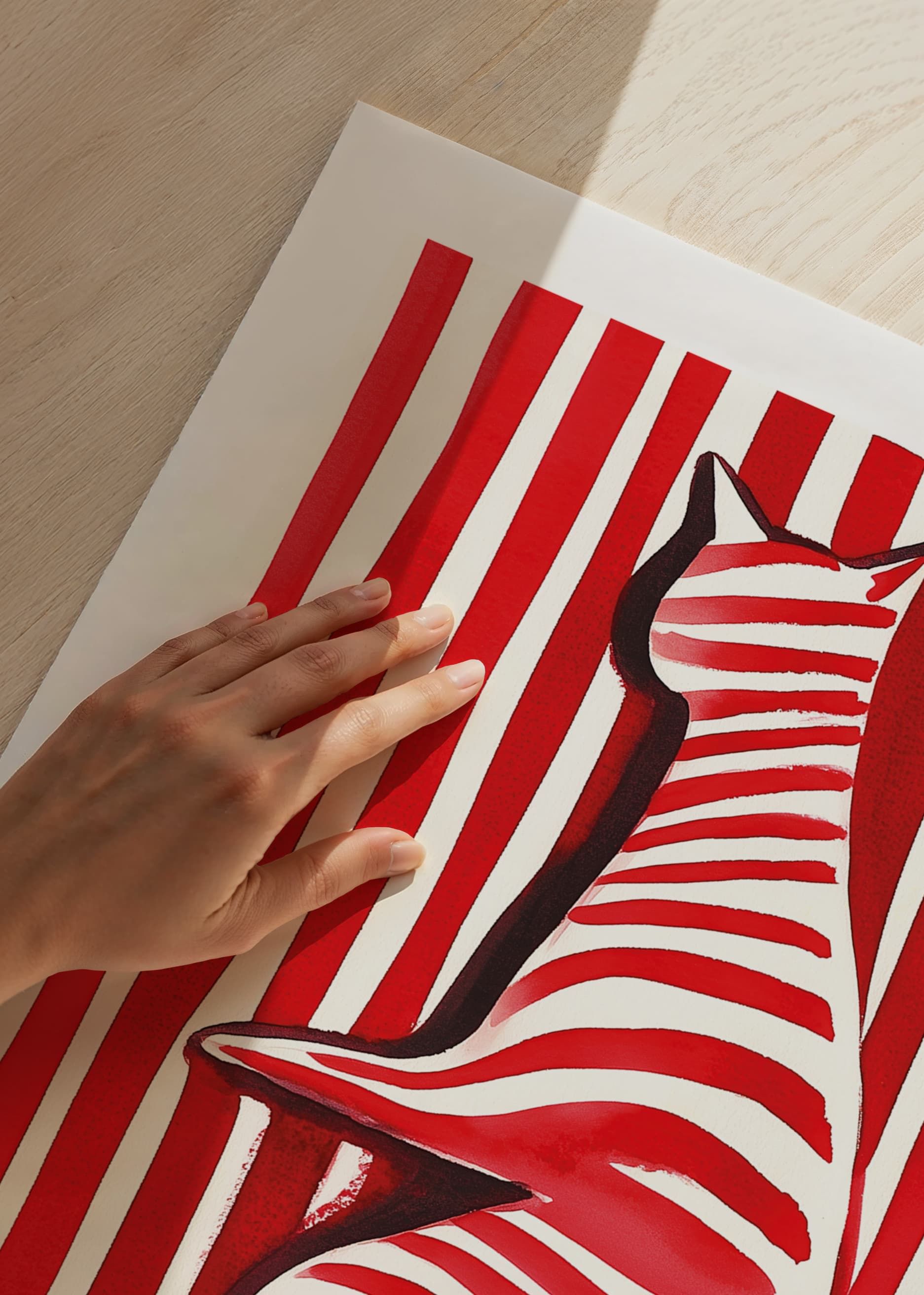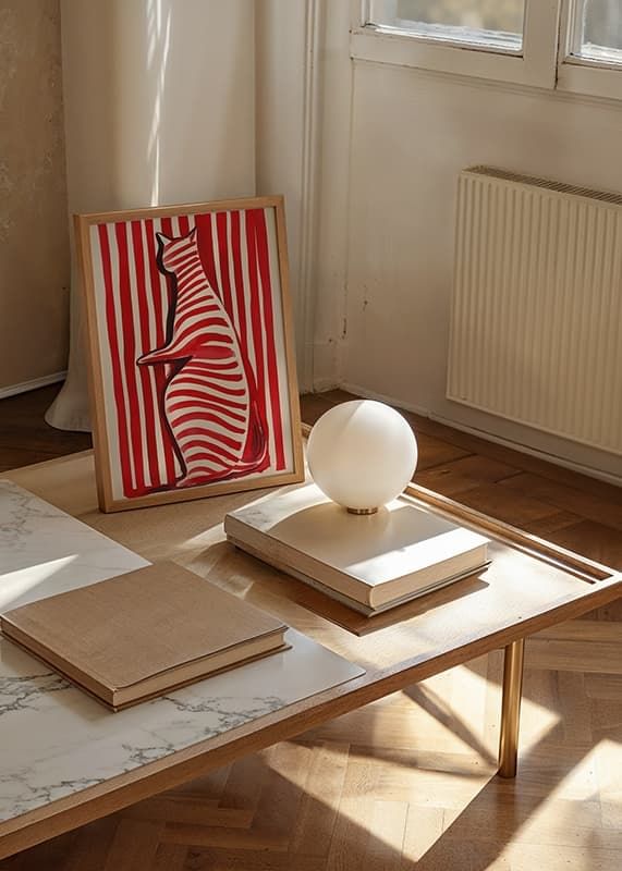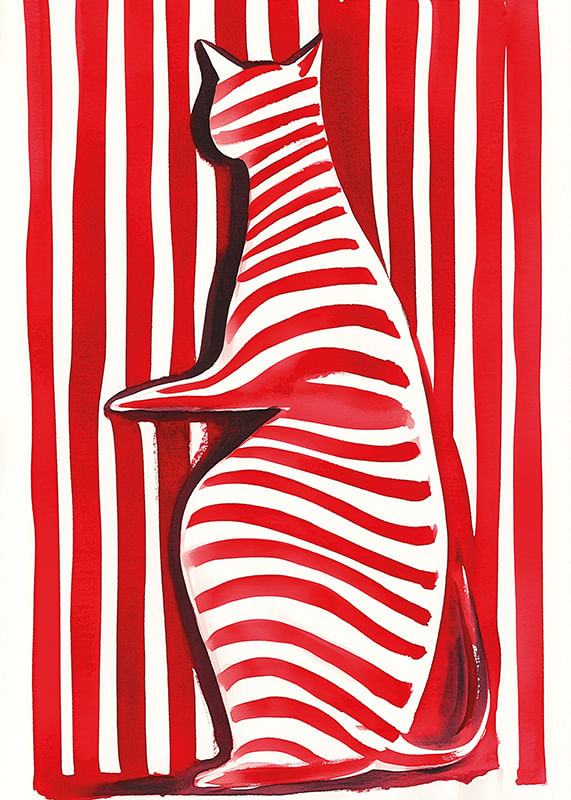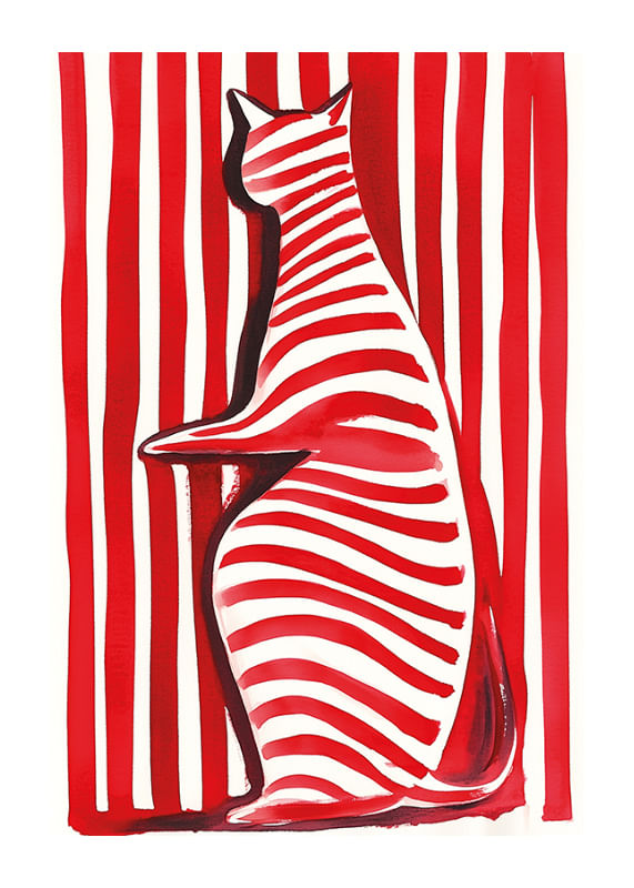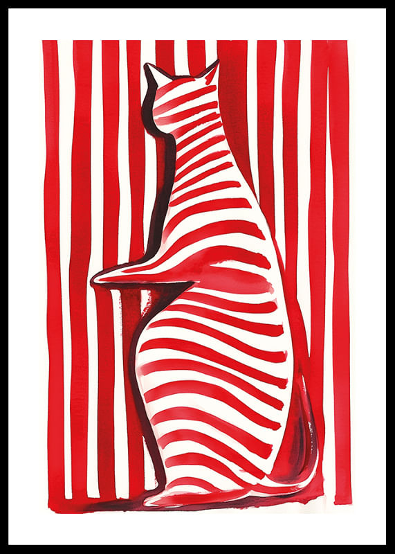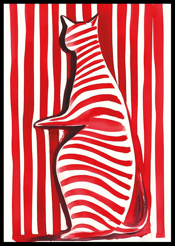 Denna poster vibrerar med liv och lekfullhet! En katt, målad i djärva röda och vita randiga mönster, framträder mot en bakgrund av liknande ränder. Den skapade illusionen gör betraktaren fängslad och utmanar ögat.