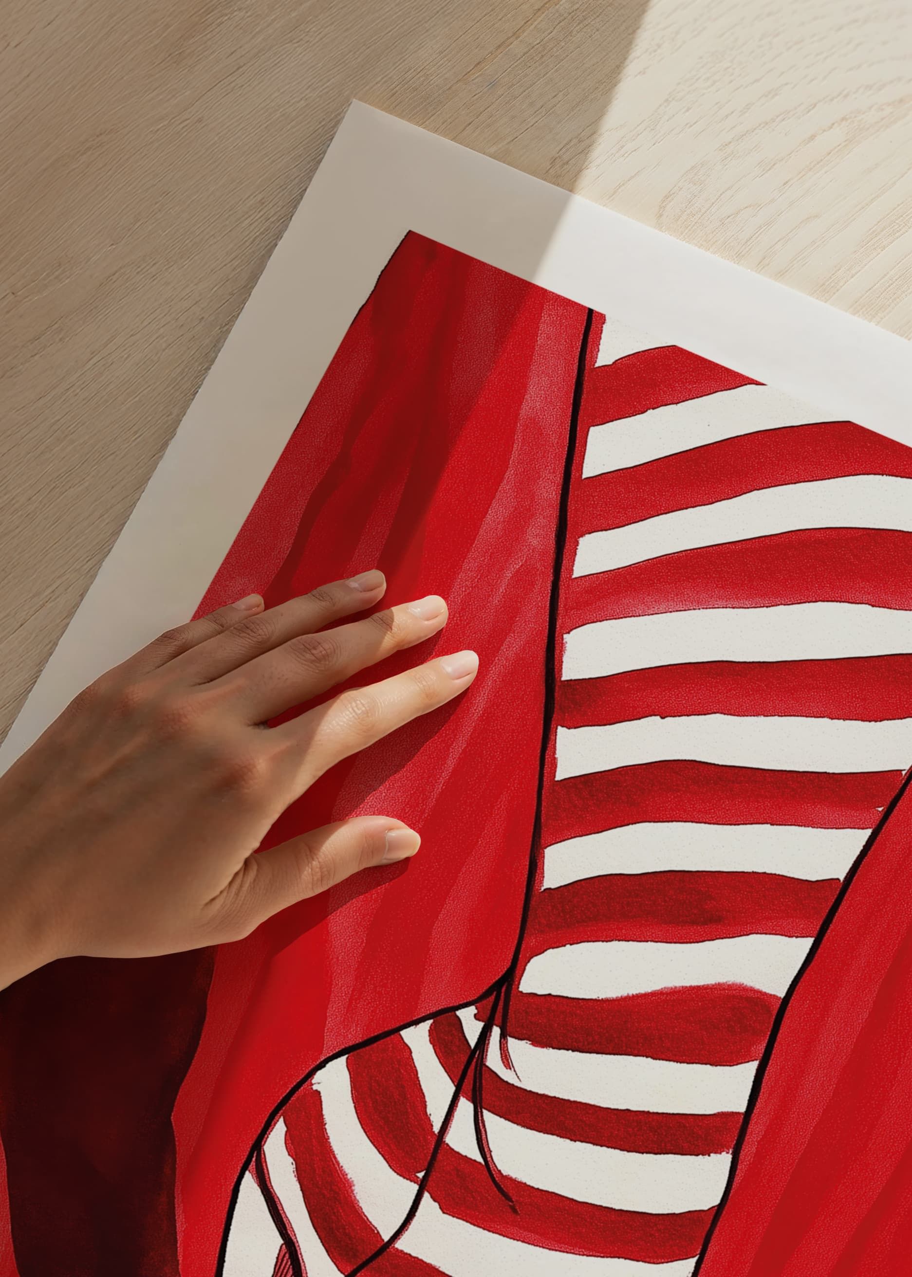 Förvandla ditt rum med denna kraftfulla poster där ränder i rött och vitt skapar en visuell explosion av stil och elegans. Den djärva kontrastrika designen väcker intresse och sätter en livfull prägel på varje omgivning. Perfekt för den som vågar sticka ut och vill fylla sin vägg med energi och karaktär.