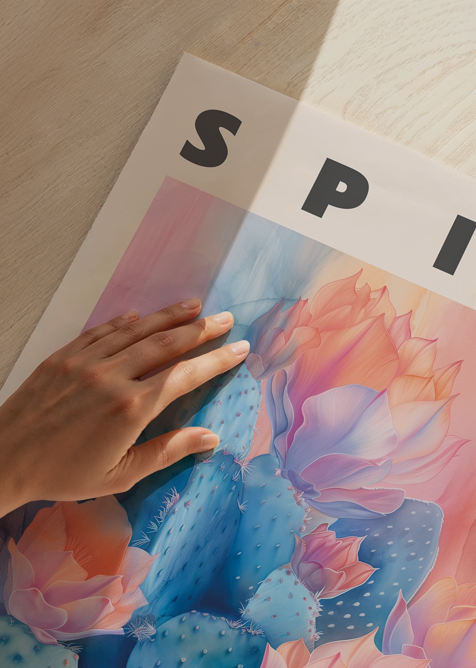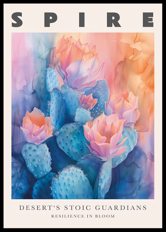 Upptäck en värld av färger med denna fantastiska poster som förenar öknens stilla skönhet med naturens spektakulära blomning. Med mjuka pasteller som dansar över kaktusarnas kraftfulla former, skapar denna bild en atmosfär av lugn och styrka.