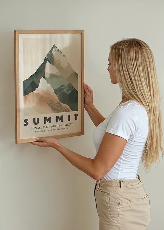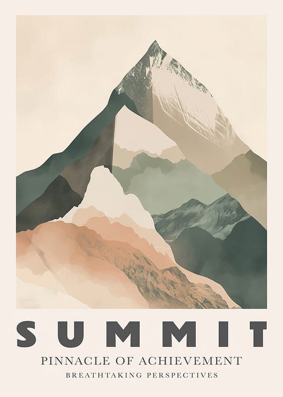 Förvandla ditt rum med denna inspirerande poster som fångar bergstopparnas majestät. Den stilrena designen i mjuka färger skapar en känsla av lugn och höjd, samtidigt som den uppmuntrar till eftertanke och strävan efter dina egna mål.