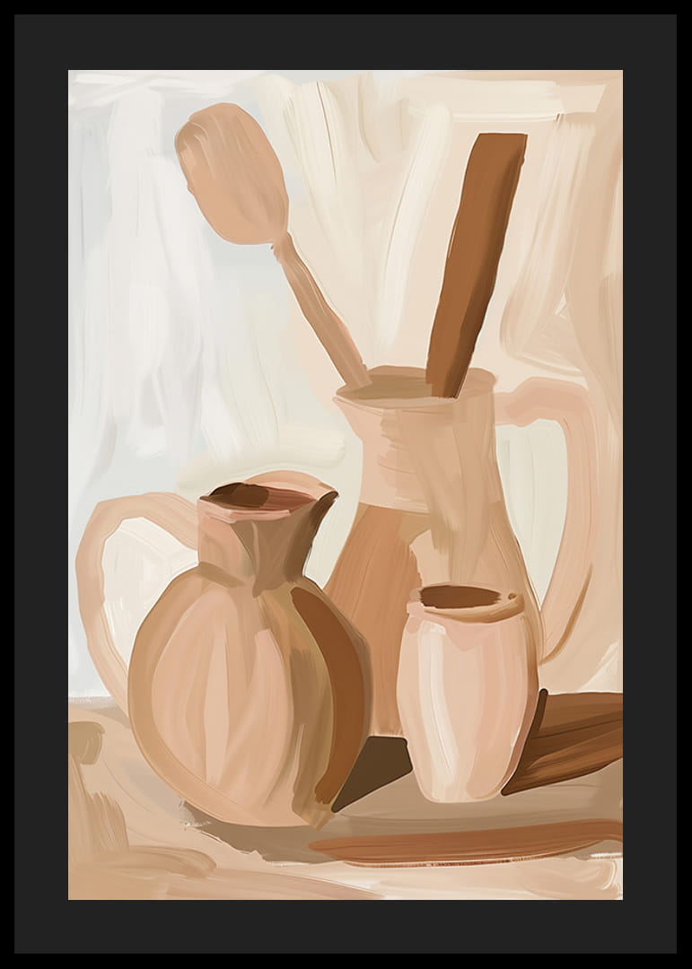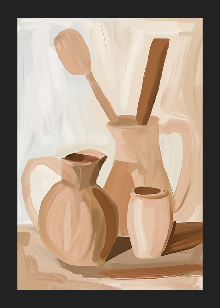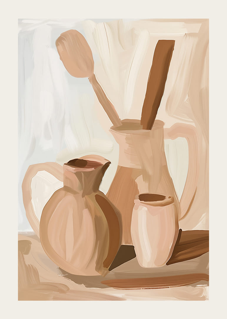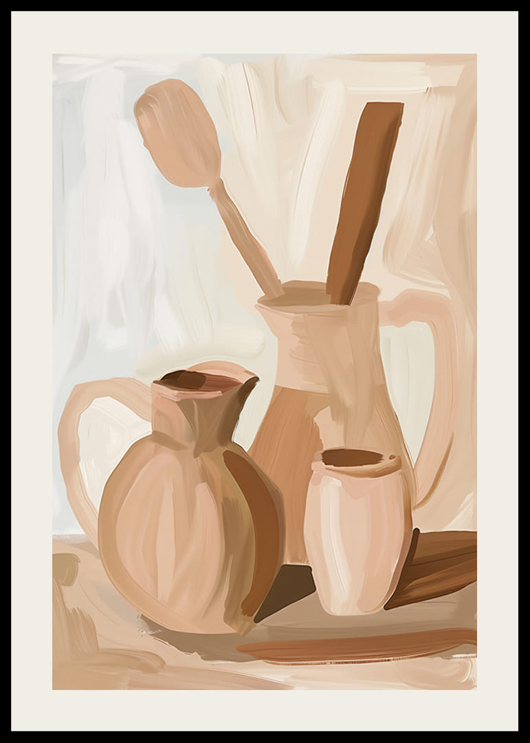 Upptäck en värld av subtil elegans med denna charmiga poster i mjuka, jordnära nyanser. Varma bruna toner skapar en tidlös känsla av lugn och harmoni, perfekt för att lyfta ditt vardagsrum eller kök. Denna konstverk andas enkelhet och funktionalitet, en hyllning till vardagens skönhet.