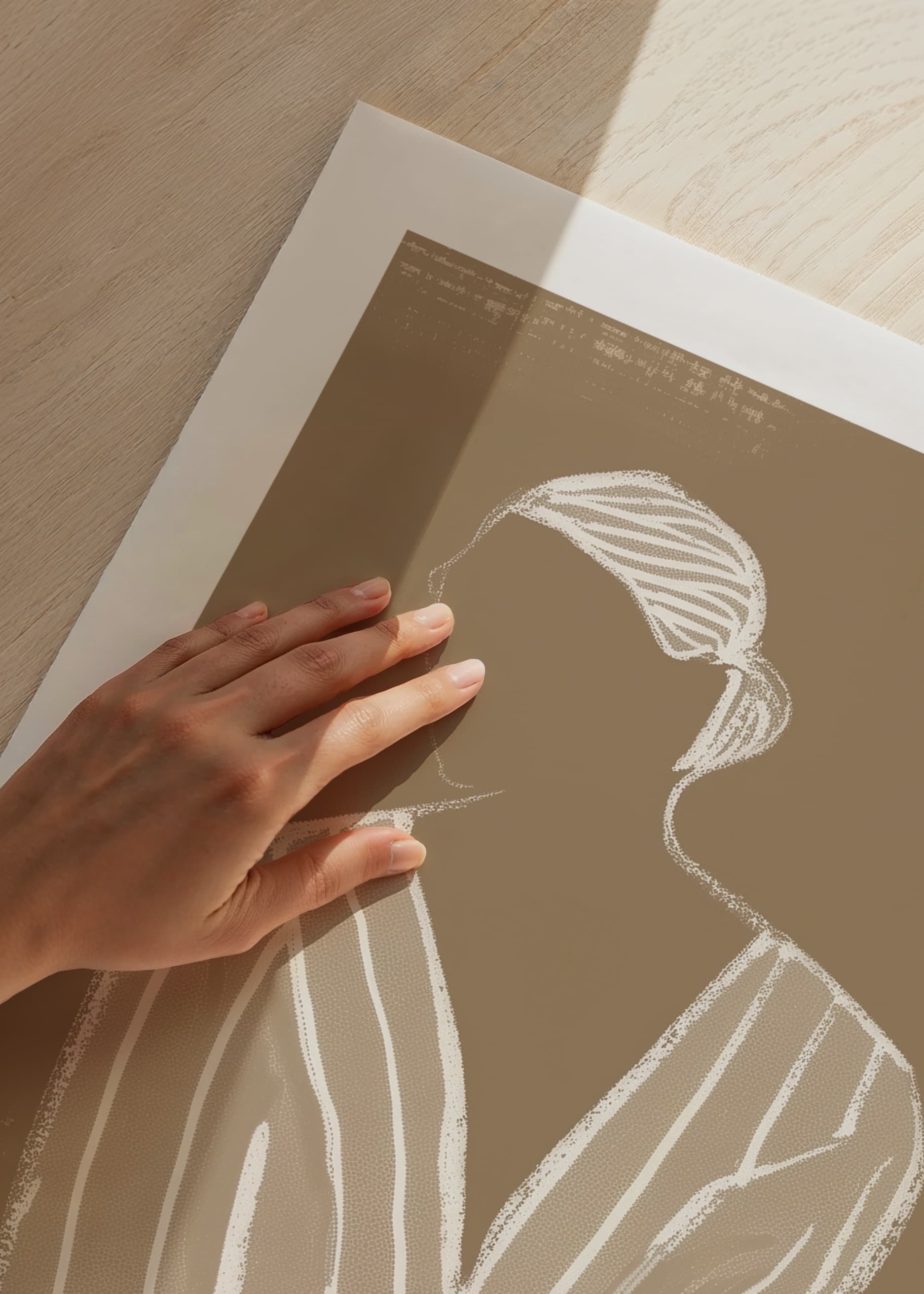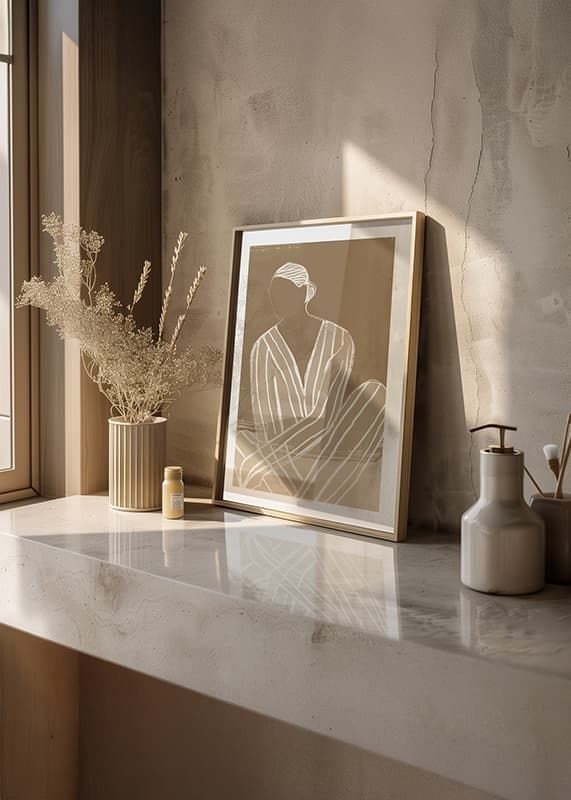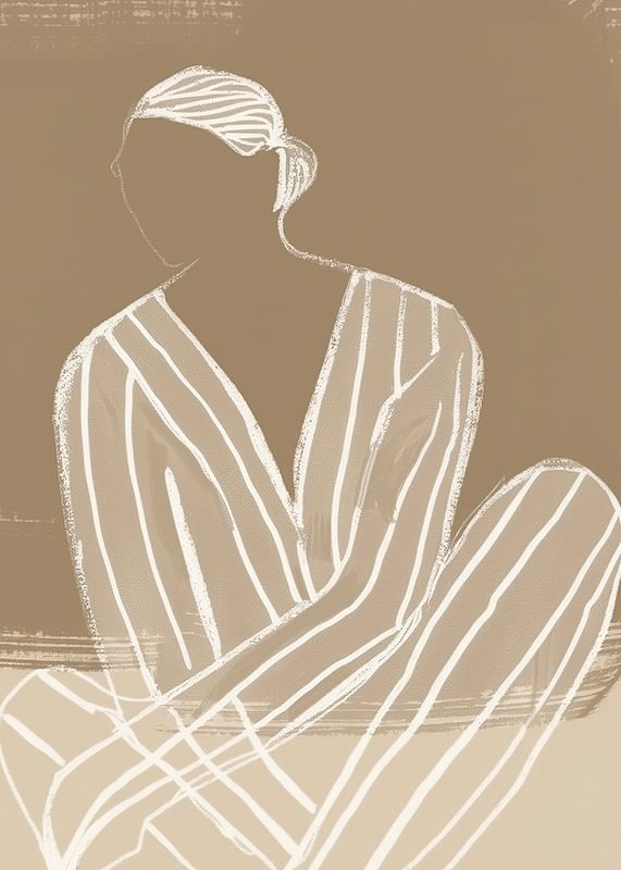 Upptäck den lugna elegansen i denna poster där en stiliserad figur omsluts av mjuka, jordnära toner. De subtila linjerna formar en avkopplad gestalt, vilket skapar en känsla av harmoni och enkelhet.