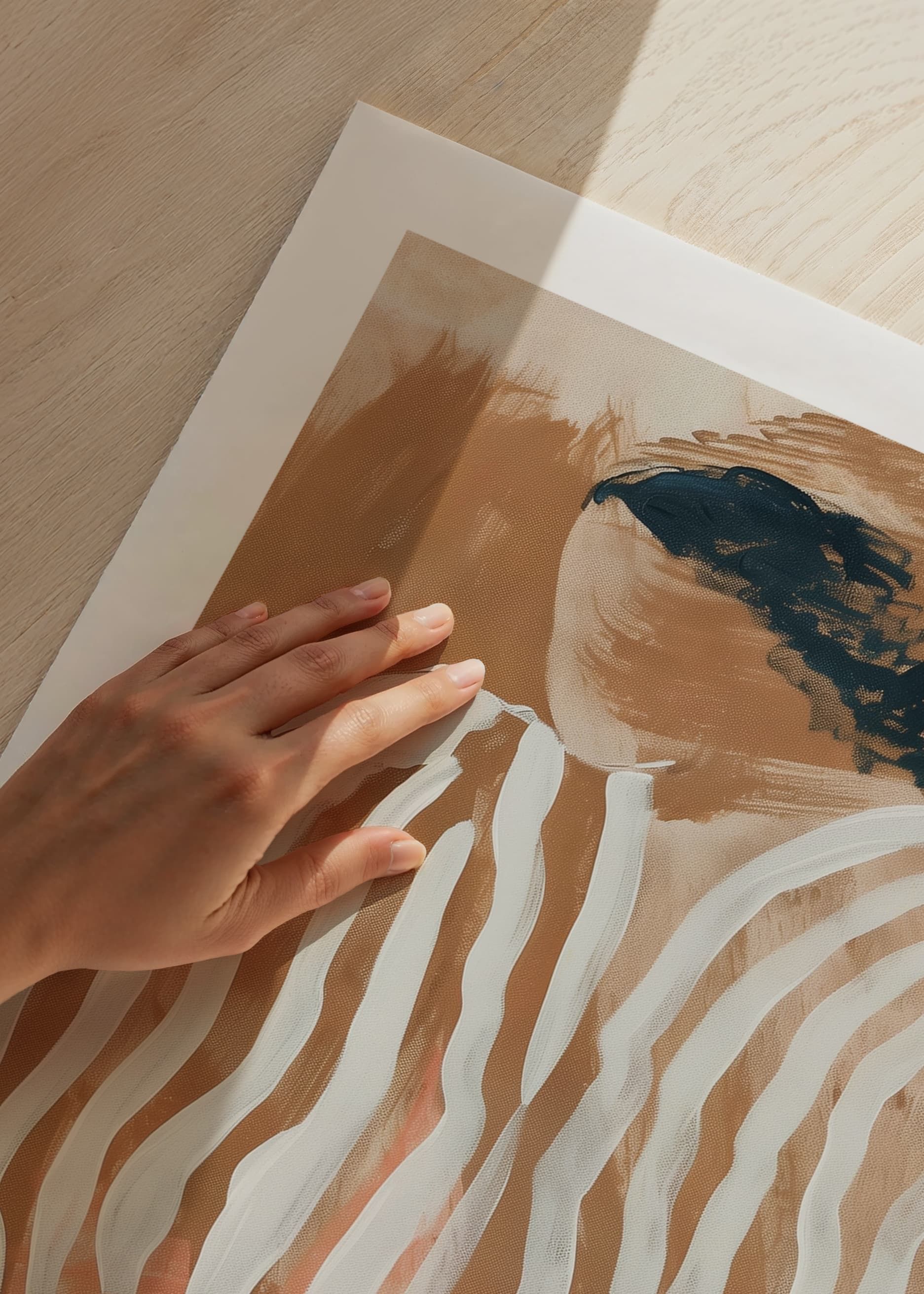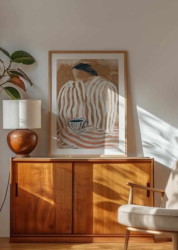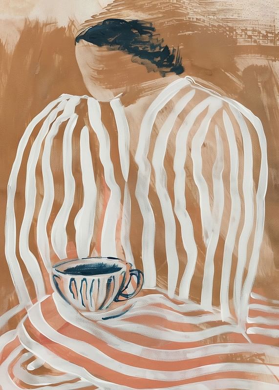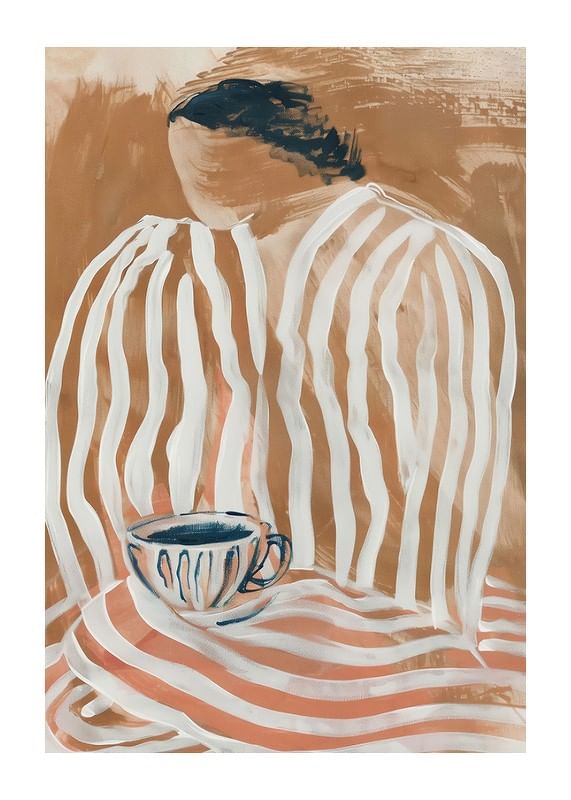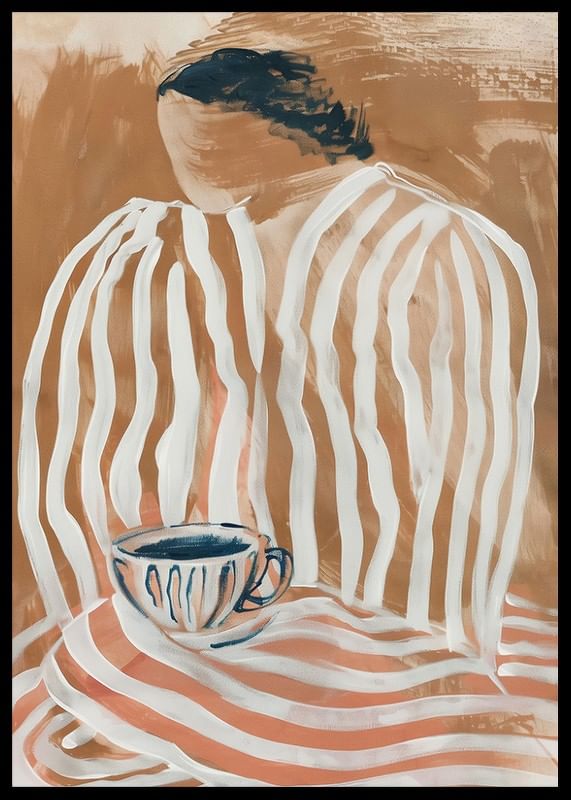 Förlora dig i denna fängslande poster där mjuka jordtoner och flytande linjer möts i en harmonisk dans. Ett ögonblick av lugn fångas med en ångande kopp som bjuder in till reflektion. Den skira, randiga silhuetten väcker en känsla av hemlighet och stillhet.