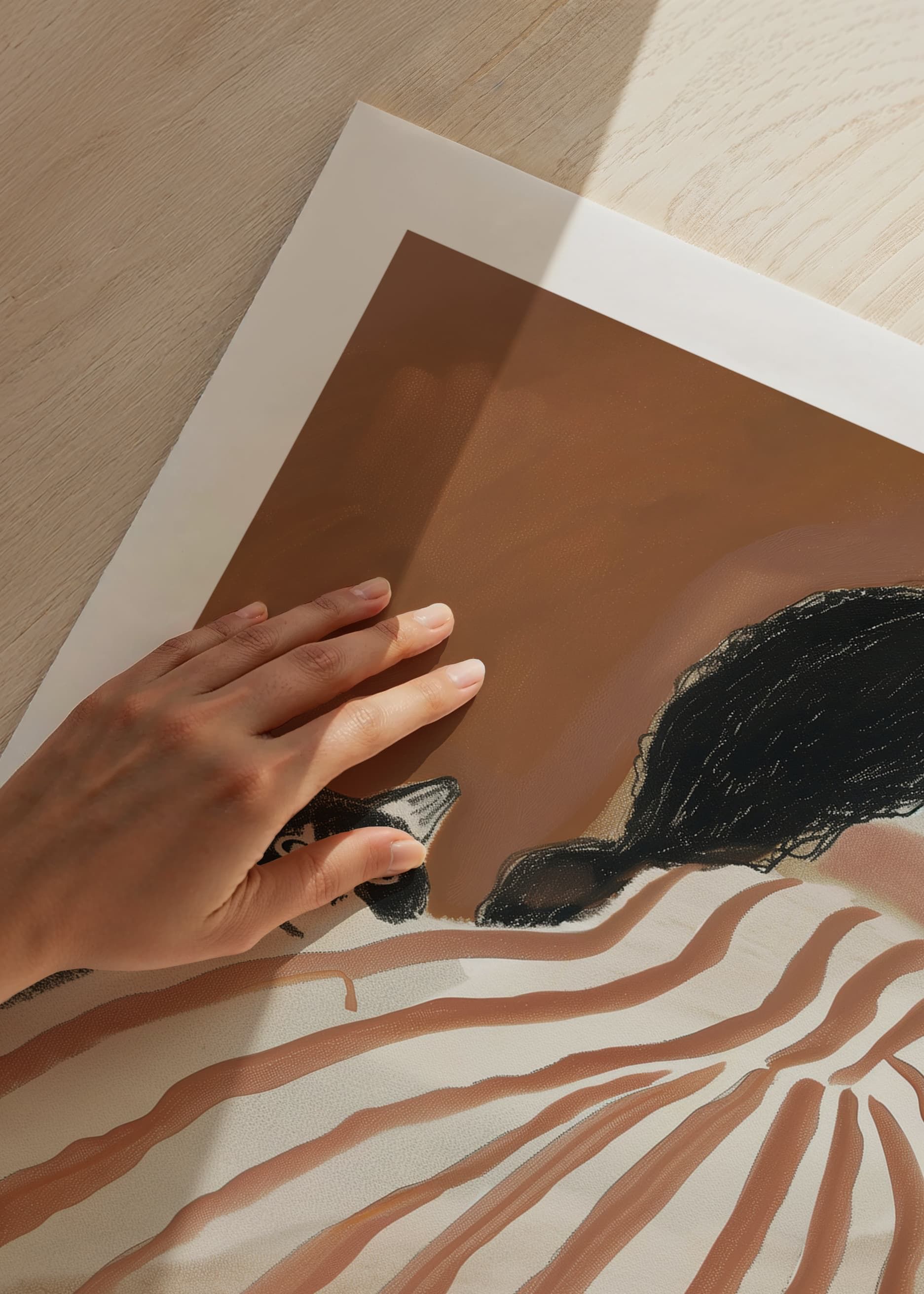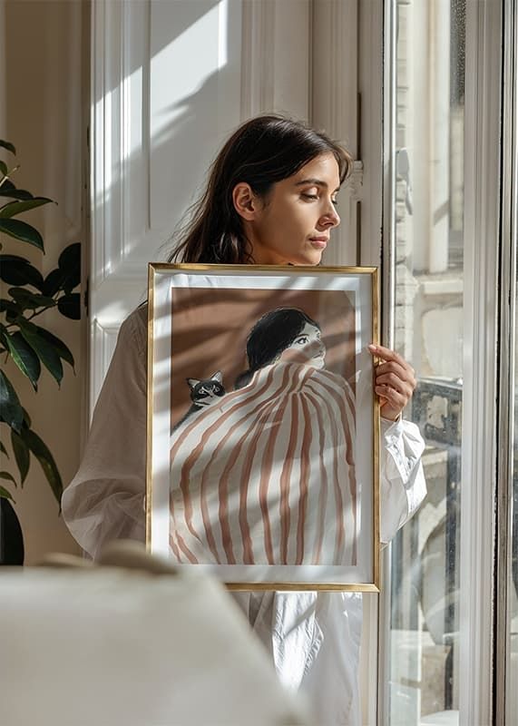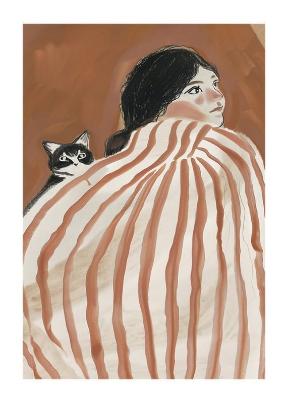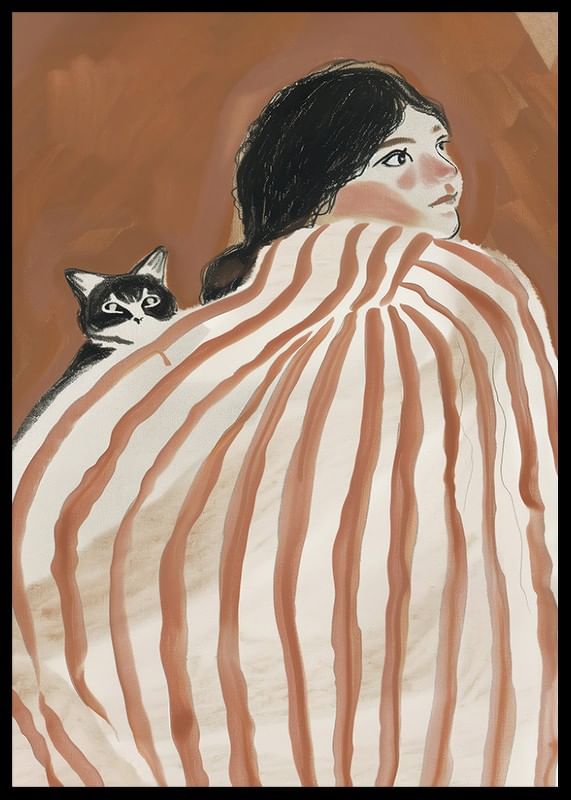 Fånga mystiken och värmen i ditt rum med denna fantastiska poster. En ung kvinna svept i en randig filt delar ett ögonblick av eftertänksamhet med sin lurviga vän vid hennes sida. De mjuka, jordnära färgerna och de uttrycksfulla blickarna förmedlar en känsla av lugn och samhörighet.