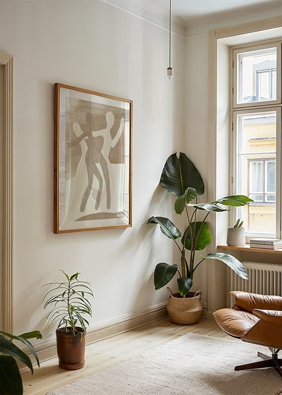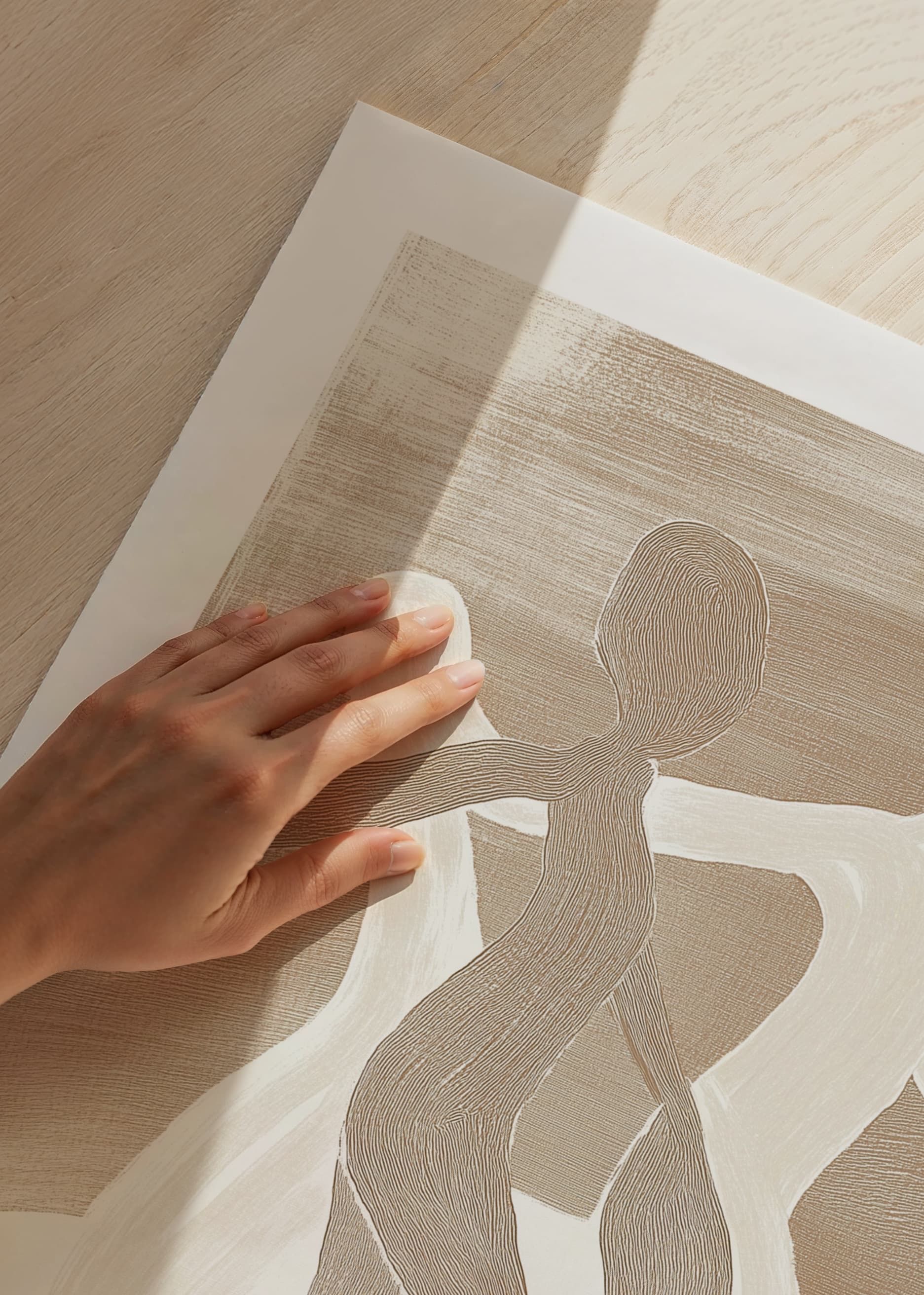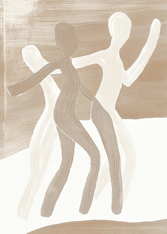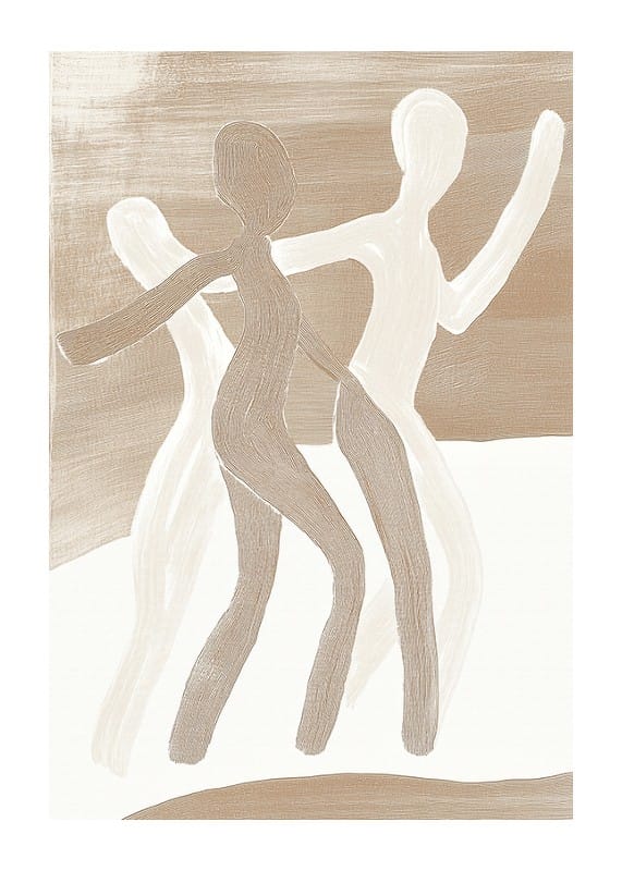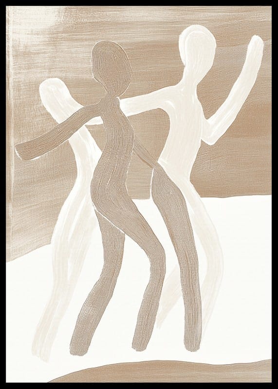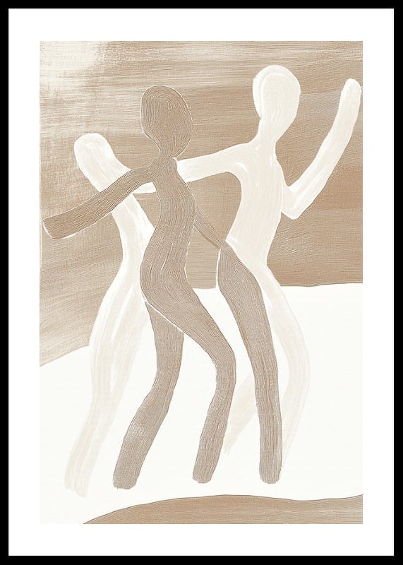 Upptäck rörelsens konst i denna fängslande poster som förenar enkelhet och dynamik. Med mjuka jordtoner och stiliserade figurer ger verket ett intryck av både rörelse och stillhet. Perfekt för att ge ditt hem en känsla av modern elegans och tidlös skönhet.