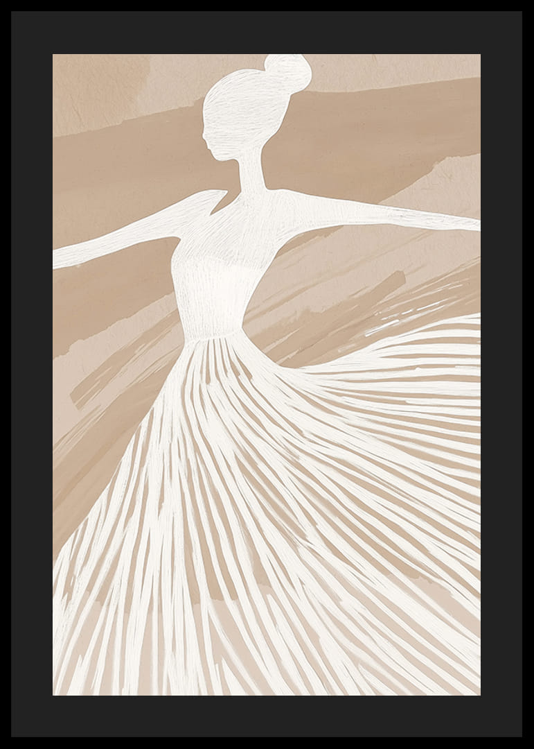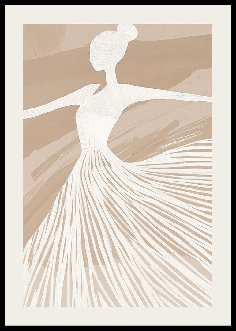 Denna poster fångar en skir balettdansares graciösa rörelser i mjuka, jordnära toner som ger rummet en känsla av elegans och flyktig skönhet. Den minimalistiska stilen och den mjuka färgpaletten skapar en harmonisk balans som smälter in i varje interiör.