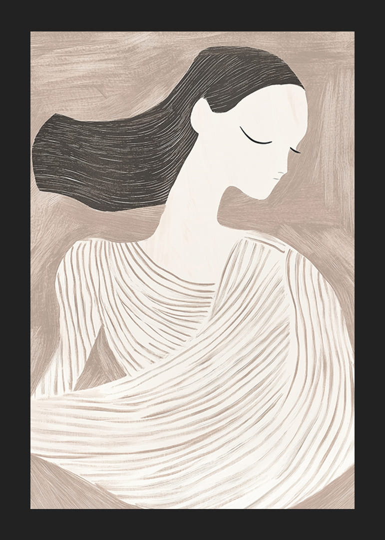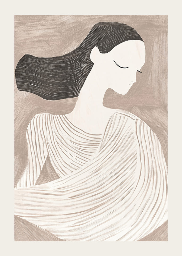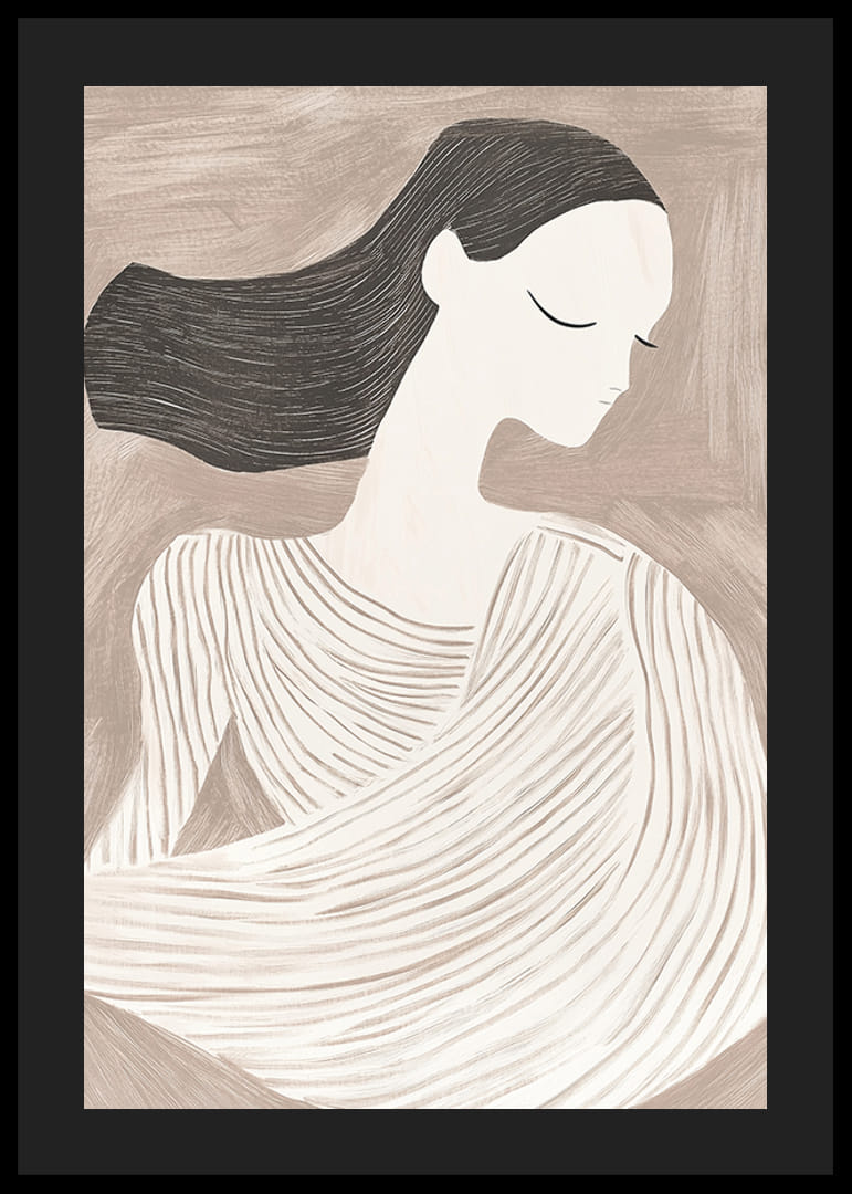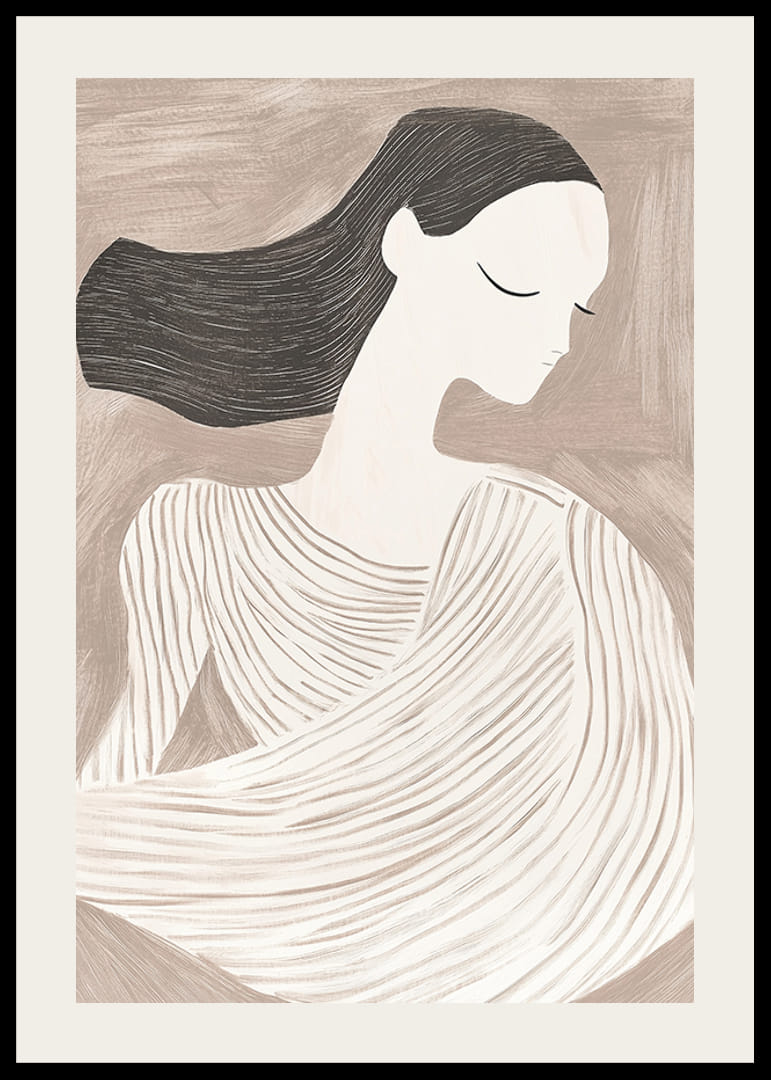 Fånga stillheten och elegansen i ditt hem med denna vackra poster. Den minimalistiska gestalten med svepande draperier och mjukt svarta linjer skapar en tidlös atmosfär av lugn och reflexion.