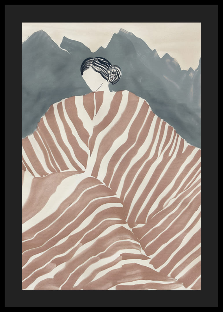 Fånga skönheten och mystiken med denna unika poster! Silhuetten av en elegant kvinna klädd i en draperad klänning som liknar majestätiska bergstoppar, väcker både nyfikenhet och beundran. De mjuka, jordnära färgerna och böljande linjerna skapar en känsla av ro och harmoni.