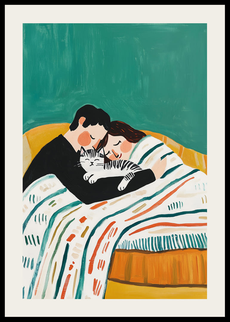 Upplev värmen och närheten i denna charmiga poster där ett par myser tillsammans med sin katt, omslutna av ett färgglatt täcke på en bekväm soffa. Den mjukt gröna bakgrunden förstärker känslan av lugn och avslappning.