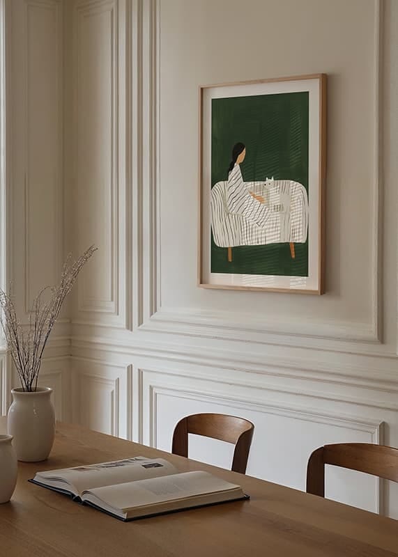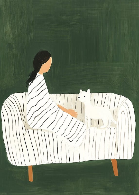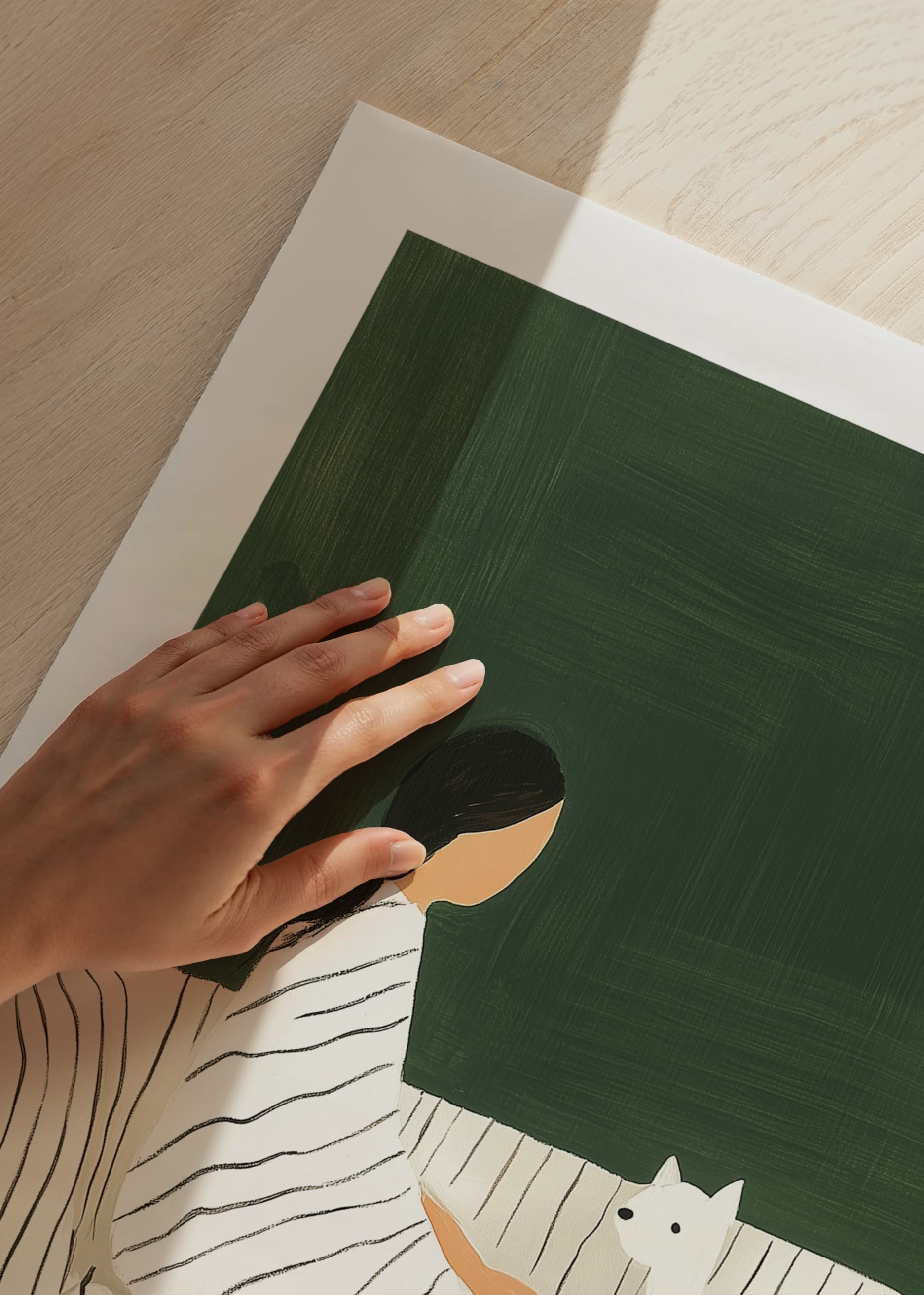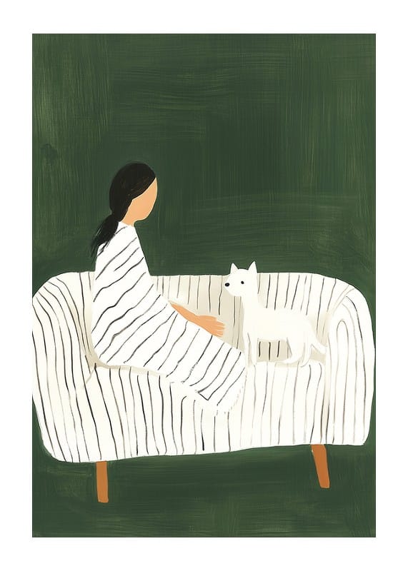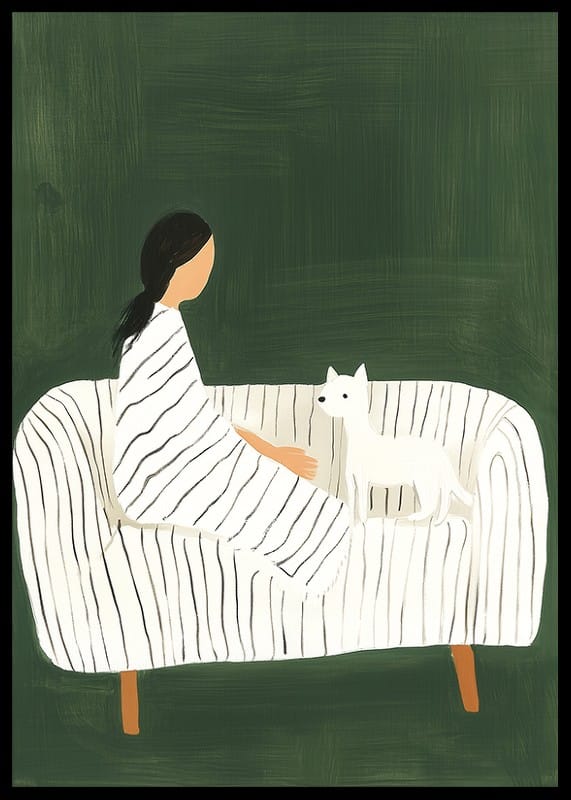Försjunk i lugnet med denna förtrollande poster, där mjuka penseldrag formar en intim scen av människa och hund, vilandes på en randig soffa mot en djupgrön bakgrund. Kontrasten mellan det vita och gröna skapar en harmonisk balans.