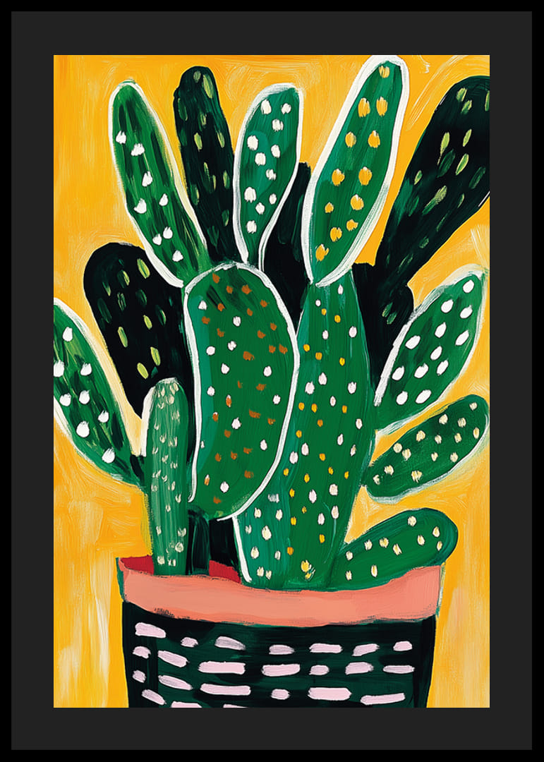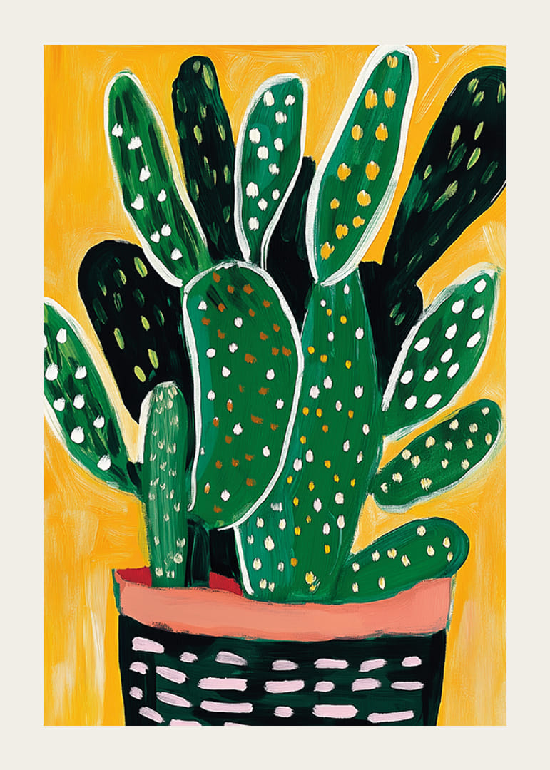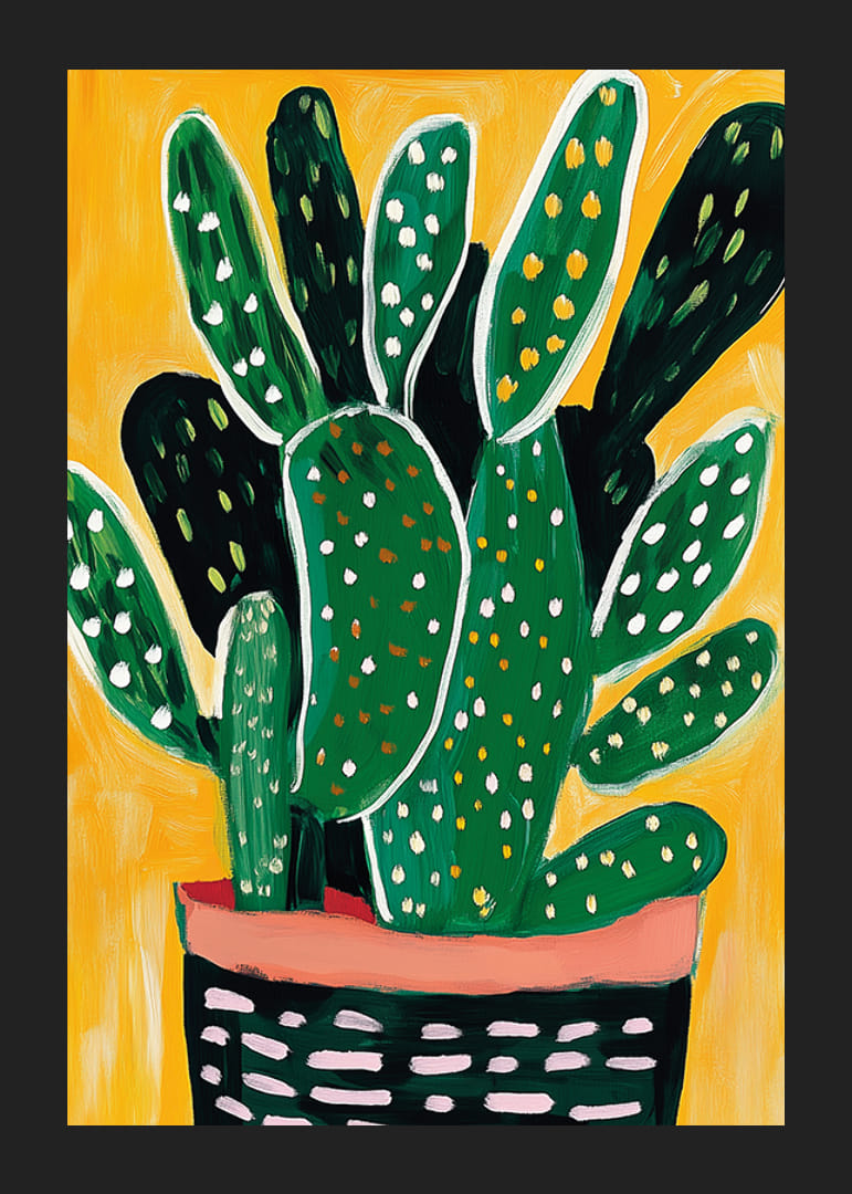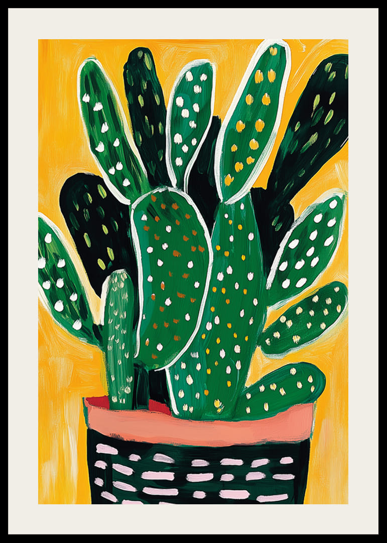 Förgyll ditt rum med denna livfulla kaktusposter! De djärva gröna nyanserna och lekfulla vita prickarna står i ljuv kontrast mot den varma gula bakgrunden, vilket skapar en glädjefylld och energisk atmosfär.