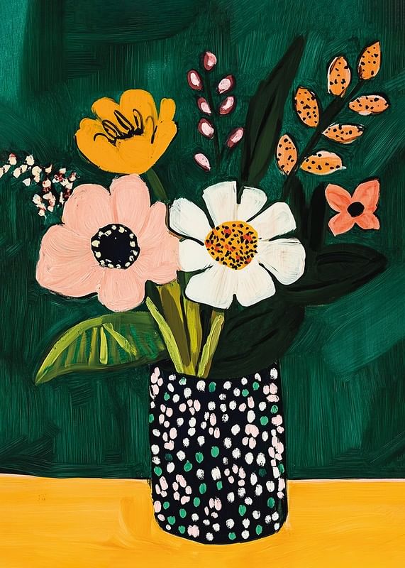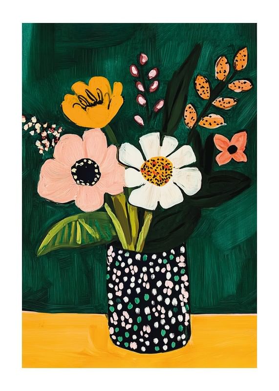 Lyft ditt rum med denna livliga poster som fångar färgsprakande blommor i en modern vas. Den djupgröna bakgrunden förstärker blommornas varma färgtoner och skapar en fascinerande kontrast.