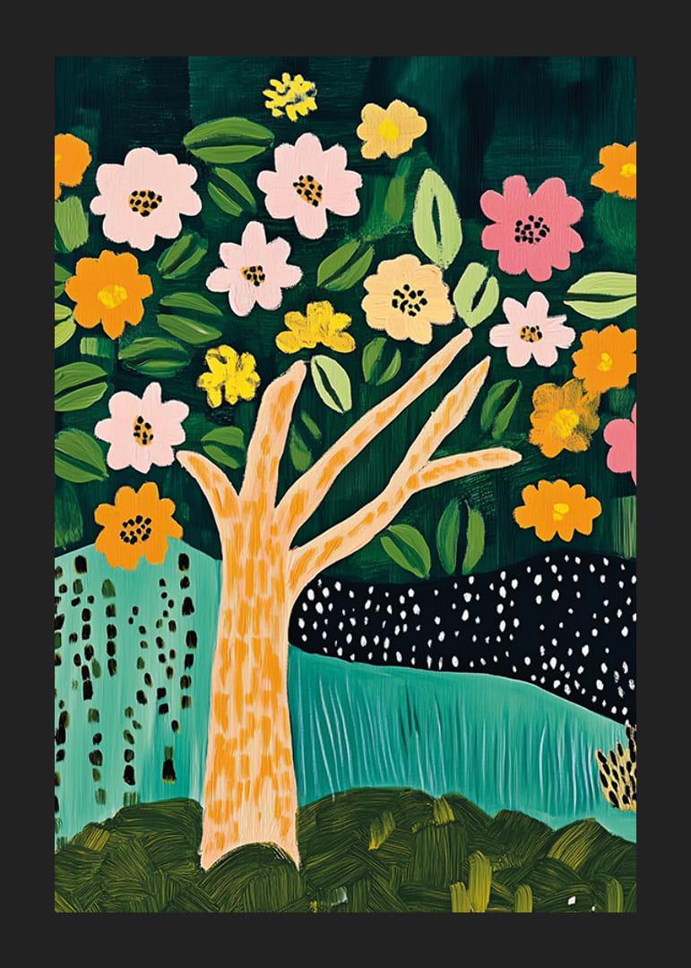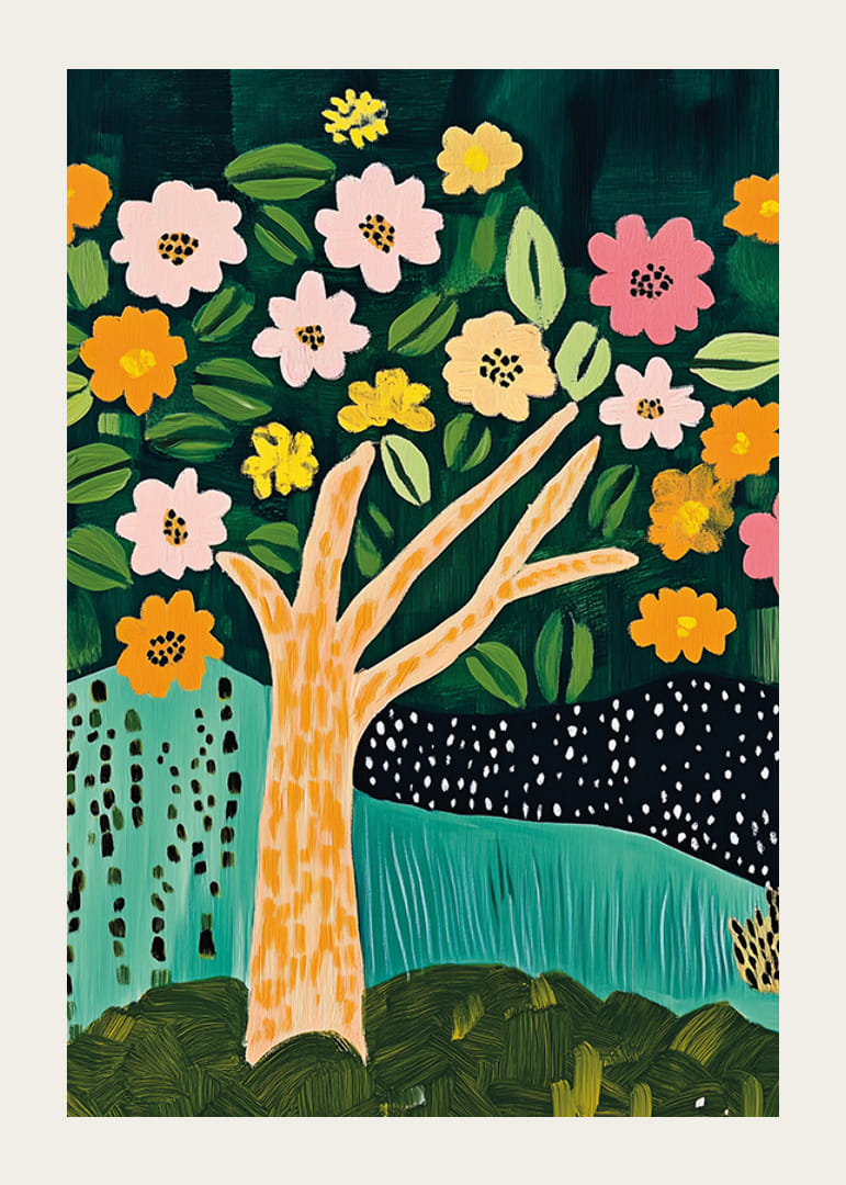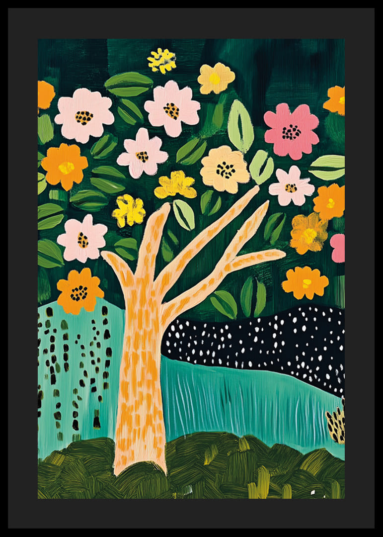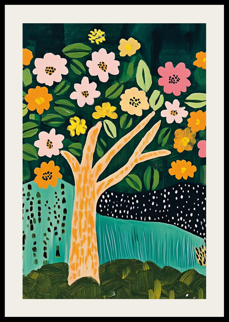 Låt naturens skönhet komma till liv i ditt hem med denna härliga poster. Ett färgstarkt träd prytt med mönstrade blad och lekfulla blommor i varma toner skapar en känsla av glädje och harmoni. Det djupa gröna landskapet erbjuder en rofylld kontrast som fördjupar bilden.