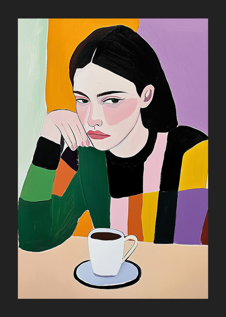 Upptäck konstens kraft med denna fängslande poster av en ung kvinna i djupa tankar. De levande färgerna och det stiliserade uttrycket förmedlar en unik kombination av melankoli och skönhet. Perfekt för att förvandla vilken vägg som helst till ett galleriutrymme.