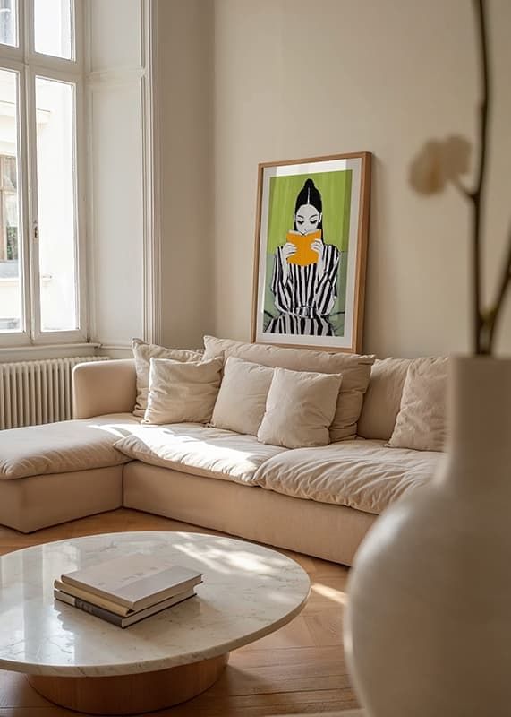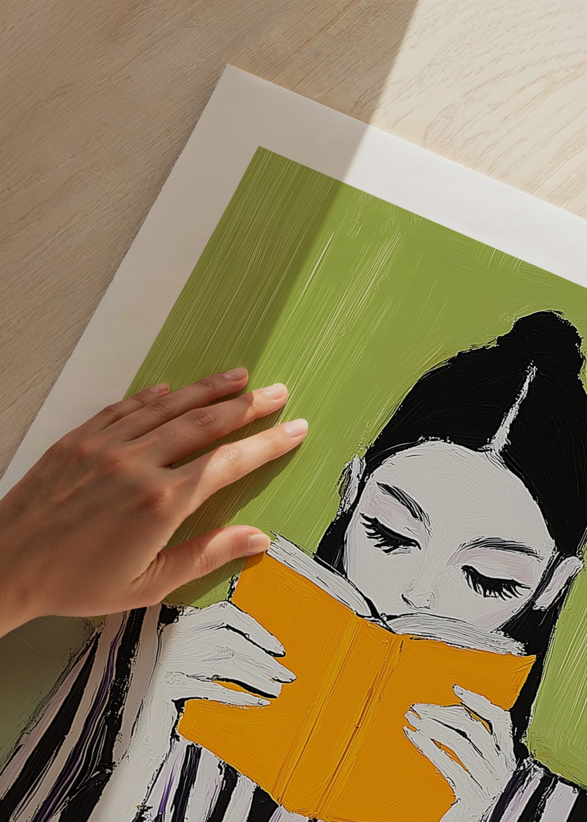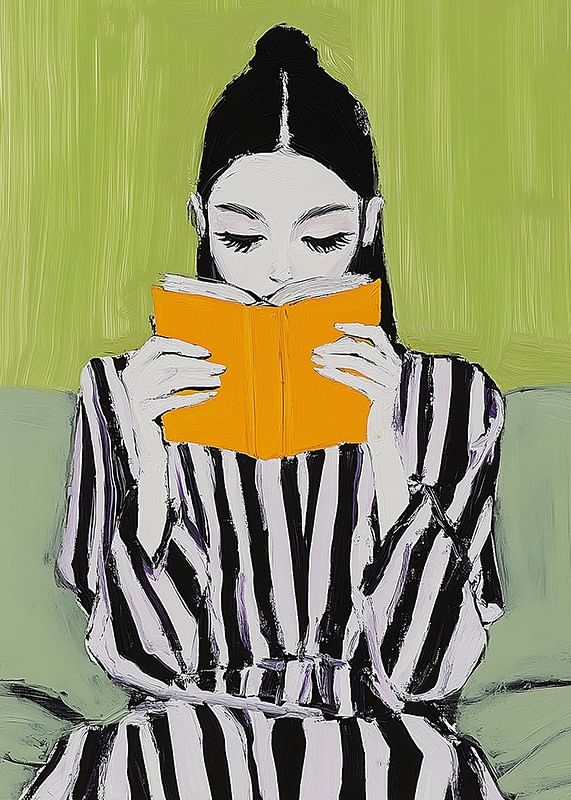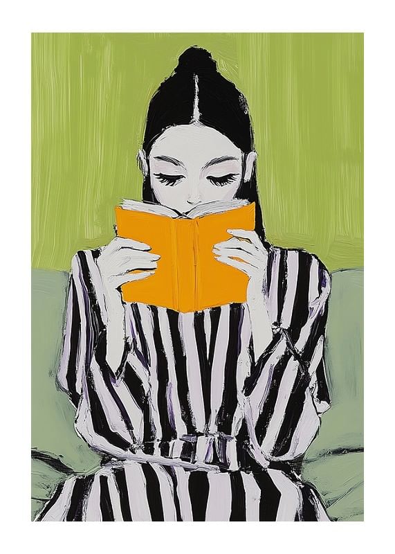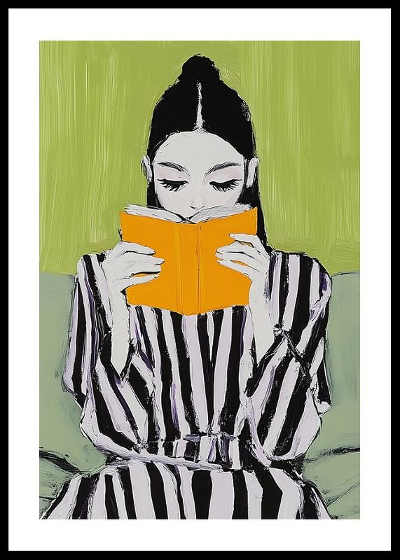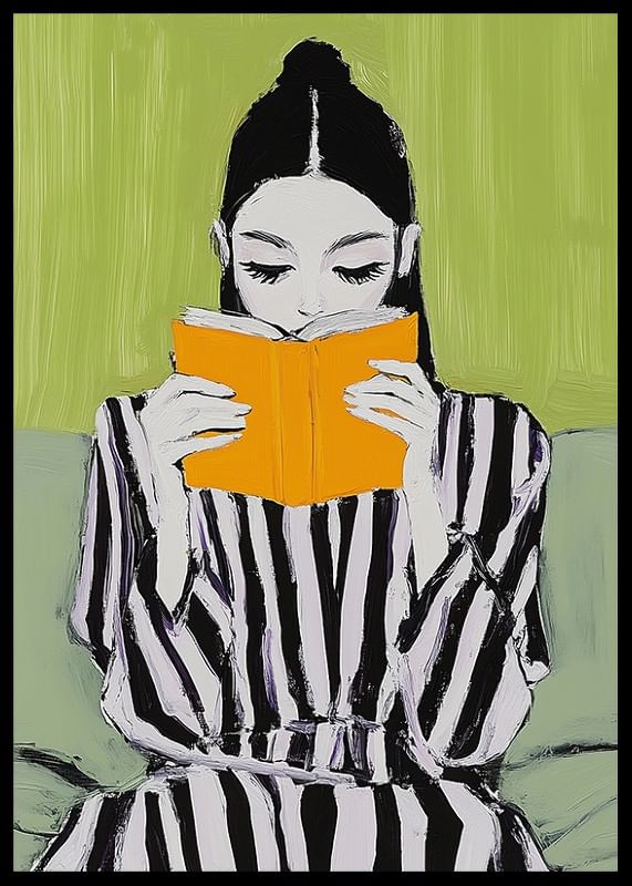 Upptäck den magiska världen av litteratur med denna fängslande poster, där en elegant kvinna i svart-vita ränder försvinner in i en livfull orange bok. Den gröna bakgrunden framhäver känslan av lugn och koncentration.