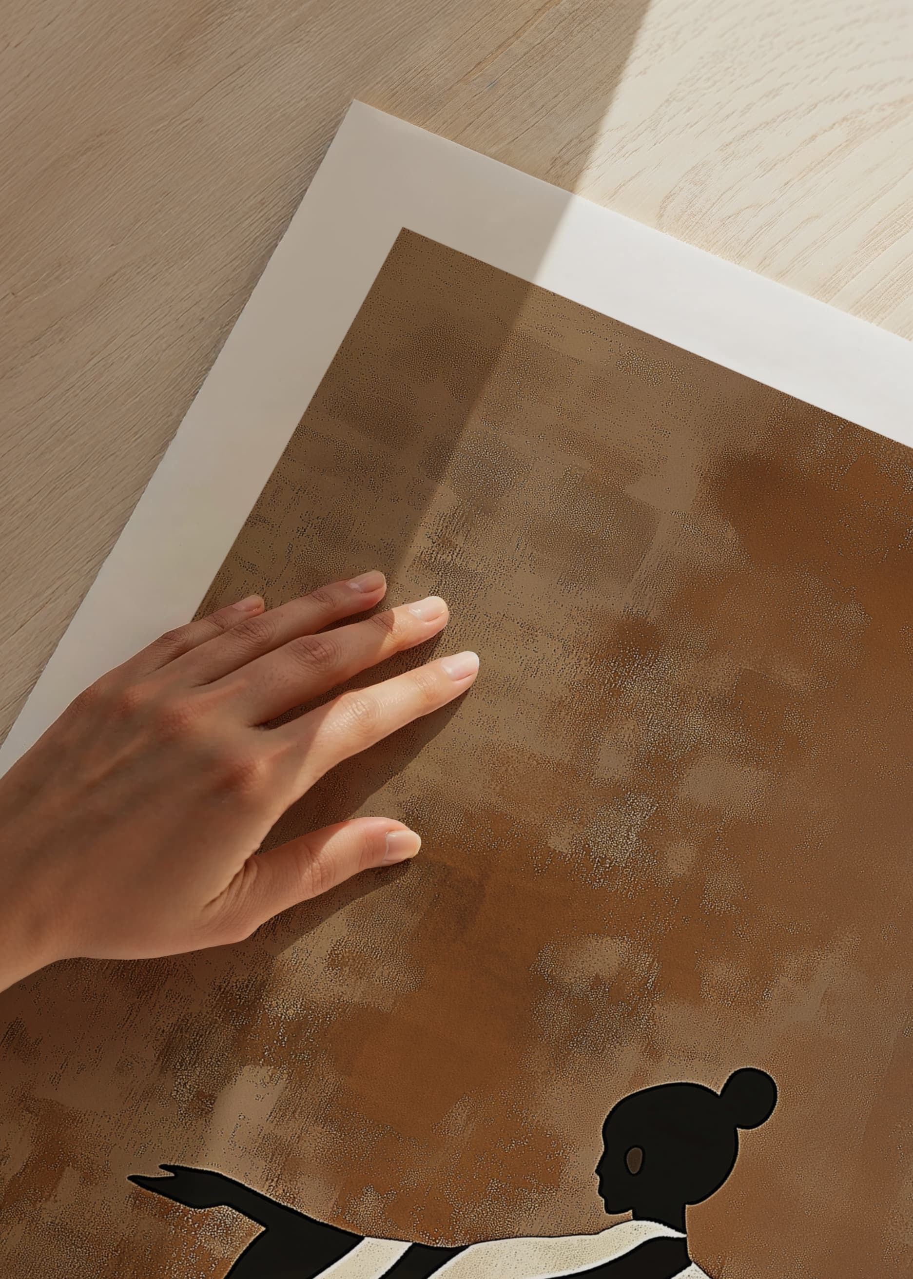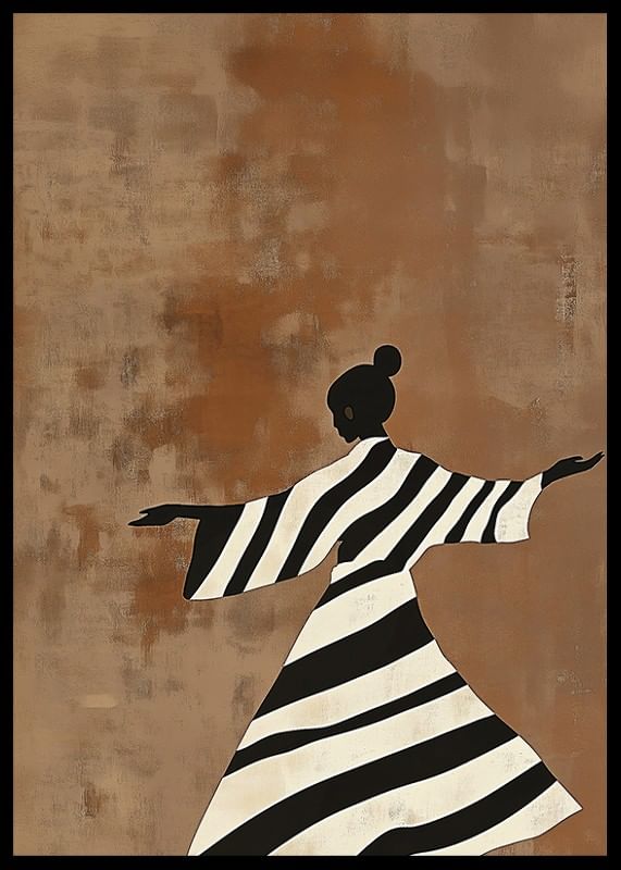 Upplev harmonin i denna eleganta poster där en siluett av en dansande figur framträder mot en jordtonad bakgrund. De iögonfallande svart-vita ränderna på klädseln skapar en känsla av rörelse och frihet, som bjuder in till reflektion och inspiration.
