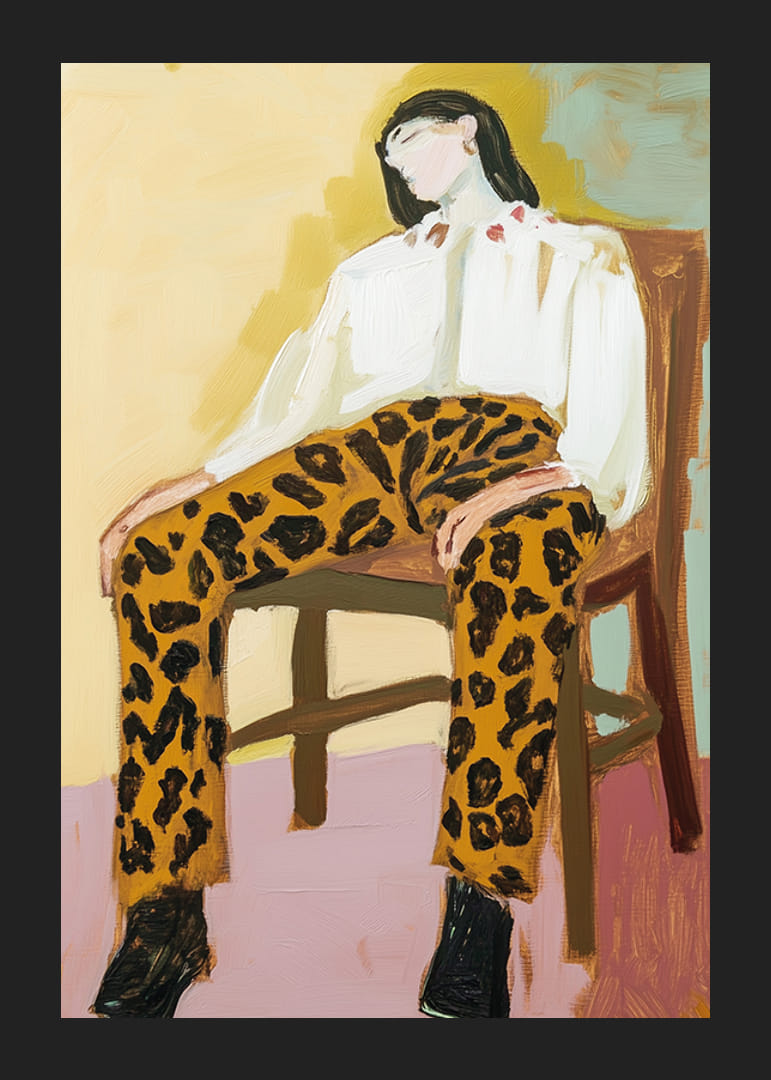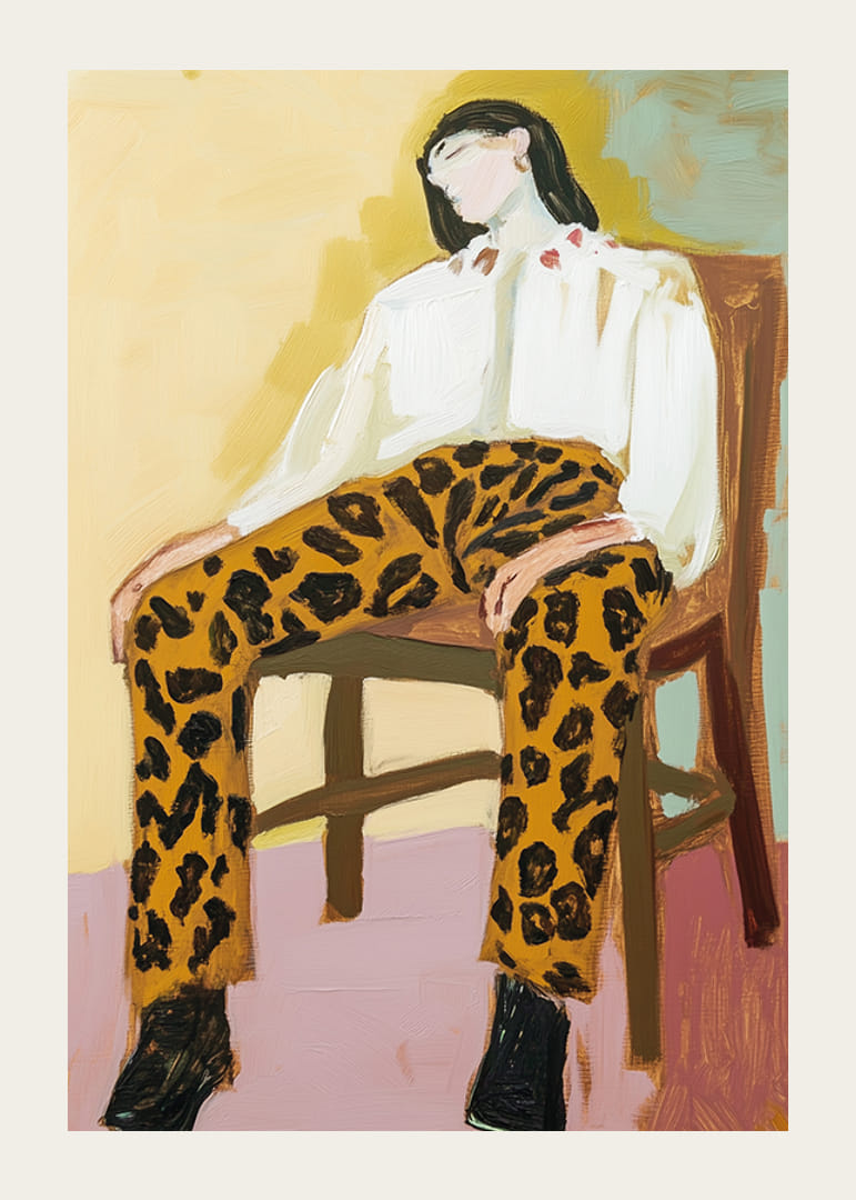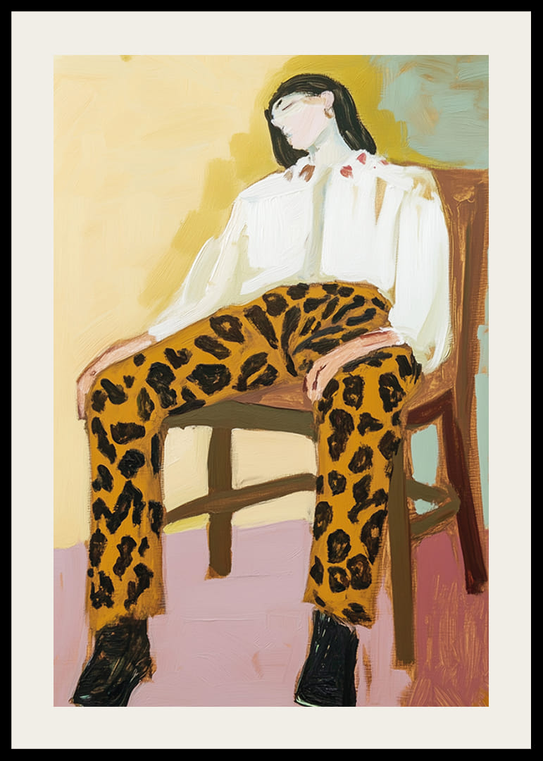 En poster som fångar avslappnad lyx och tidlös stil. Med djärva leopardmönstrade byxor, mjuka penseldrag och en drömsk atmosfär utstrålar bilden en känsla av både styrka och lätthet.