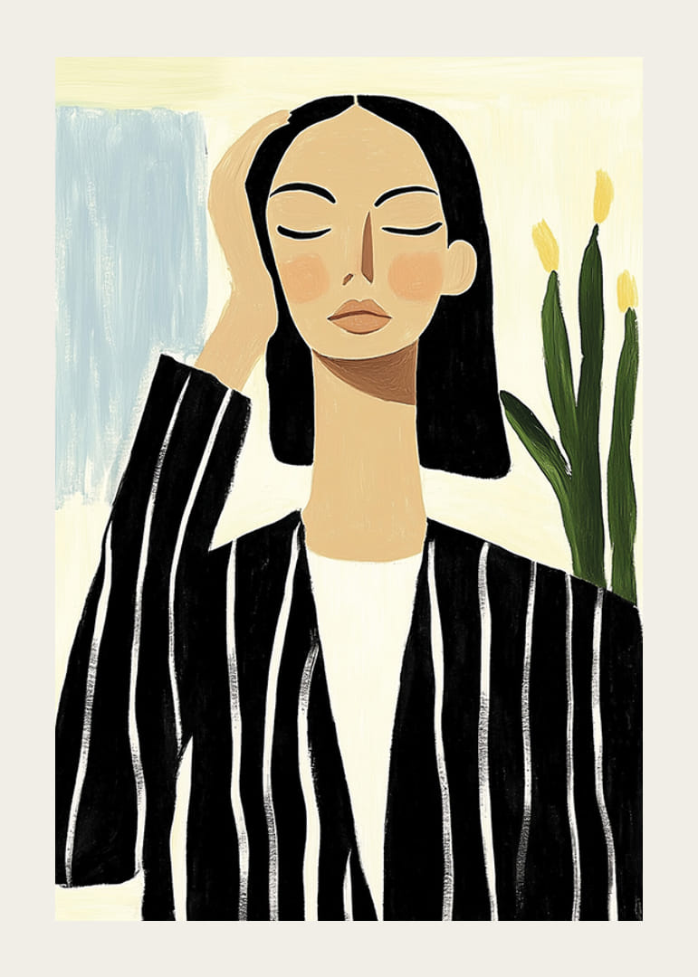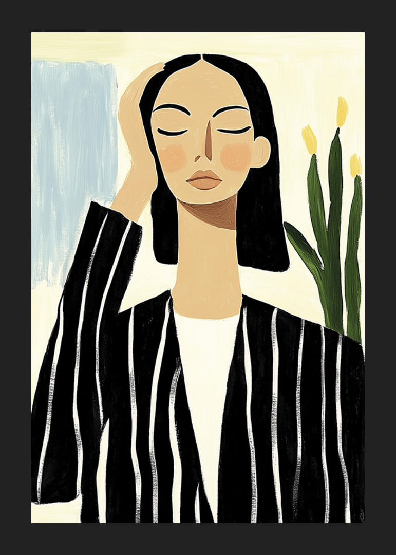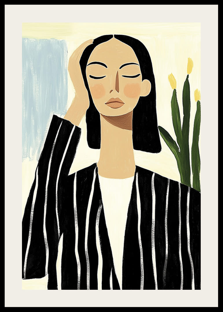 Upptäck harmonin i denna eleganta poster som fångar en känsla av lugn och självsäkerhet. Med sina djärva, svartvita ränder och det mjukt uttrycksfulla ansiktet balanserar den konstverket mellan modern stil och tidlös grace.