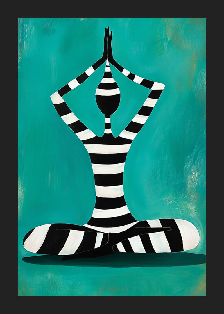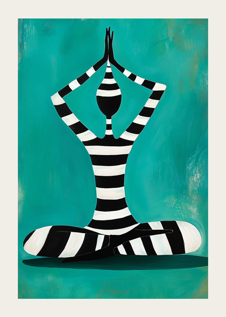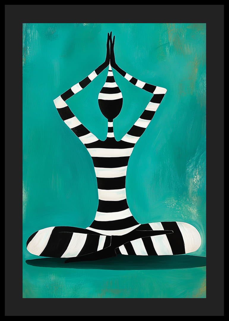 Upptäck harmoni och balans med denna kraftfulla poster. Den abstrakta figuren i svartvita ränder, sittande i meditation mot en vibrerande turkos bakgrund, förmedlar lugn och koncentration. Perfekt för att förvandla ditt rum till en plats av stillhet och inspiration.