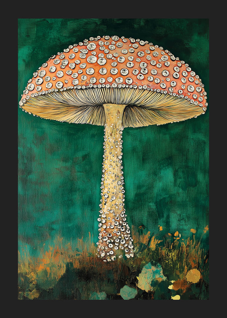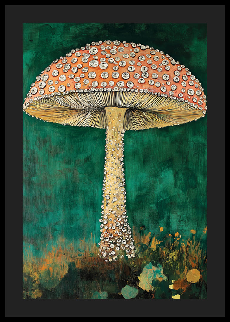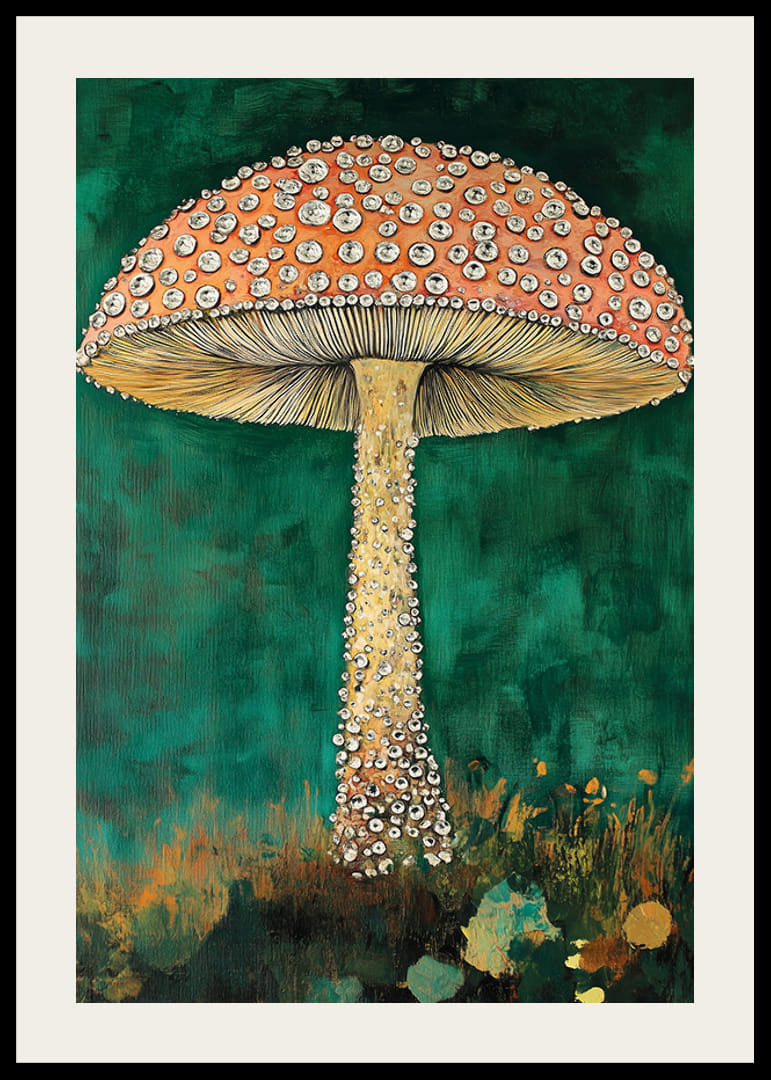 Upptäck magin i naturens detaljer med denna fängslande poster av en flugsvamp mot en djup grön bakgrund. Svampens livfulla orange och prickiga hatt glittrar nästan som ädelstenar, och förenar konstverkets sofistikerade estetik med skogens mystik.