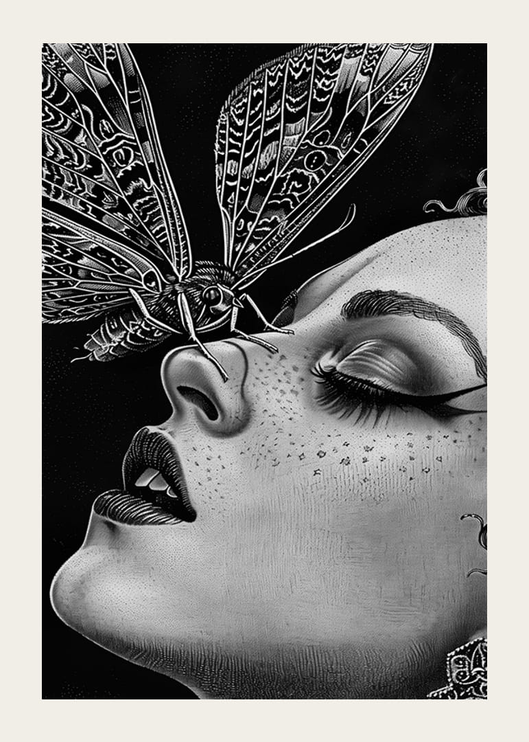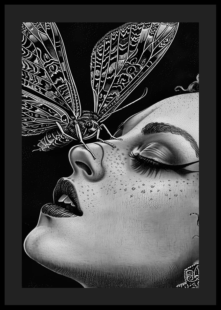 Denna poster förmedlar en känsla av mystik genom dess fantastiska svartvita struktur. En nattfjäril med intrikata vingar svävar nära ett ansikte, vilket skapar ett möte mellan dröm och verklighet. De detaljerade linjerna och kontrasten ger en magisk atmosfär.