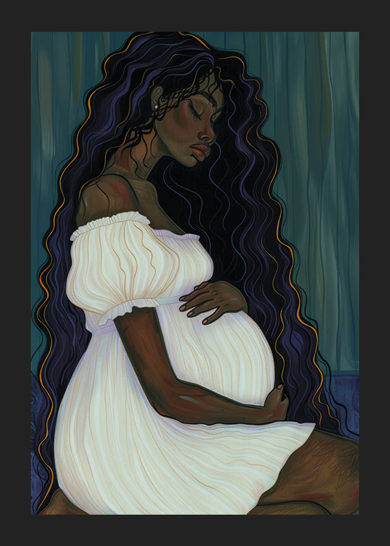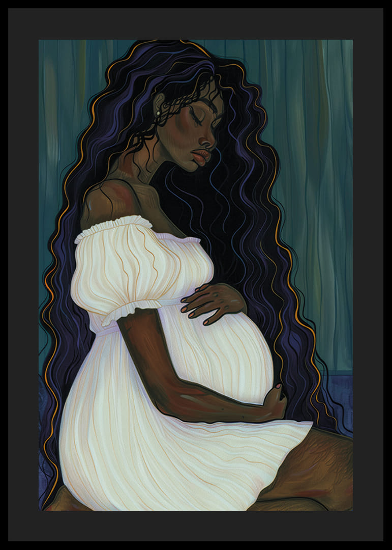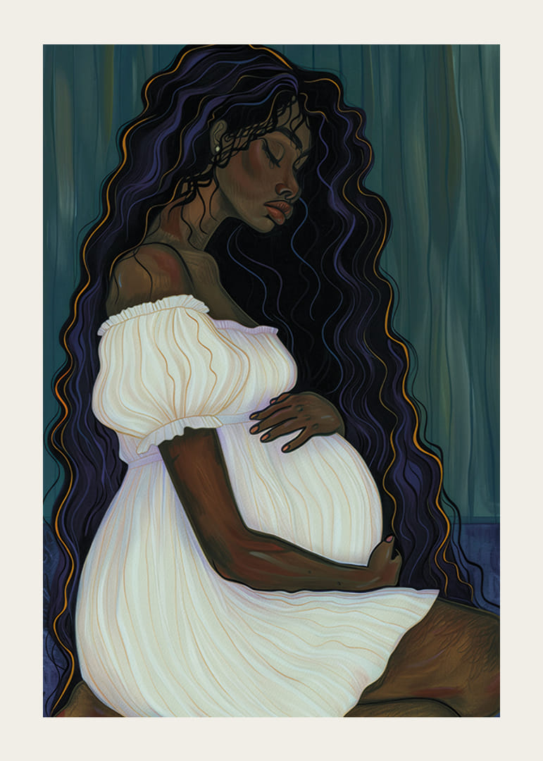 Denna poster fångar direkt betraktarens uppmärksamhet med dess mjuka färgpalett och eleganta linjer som skildrar en kvinna i stilla eftertanke. Hennes hållning och uttryck utstrålar en känsla av frid och förväntan.