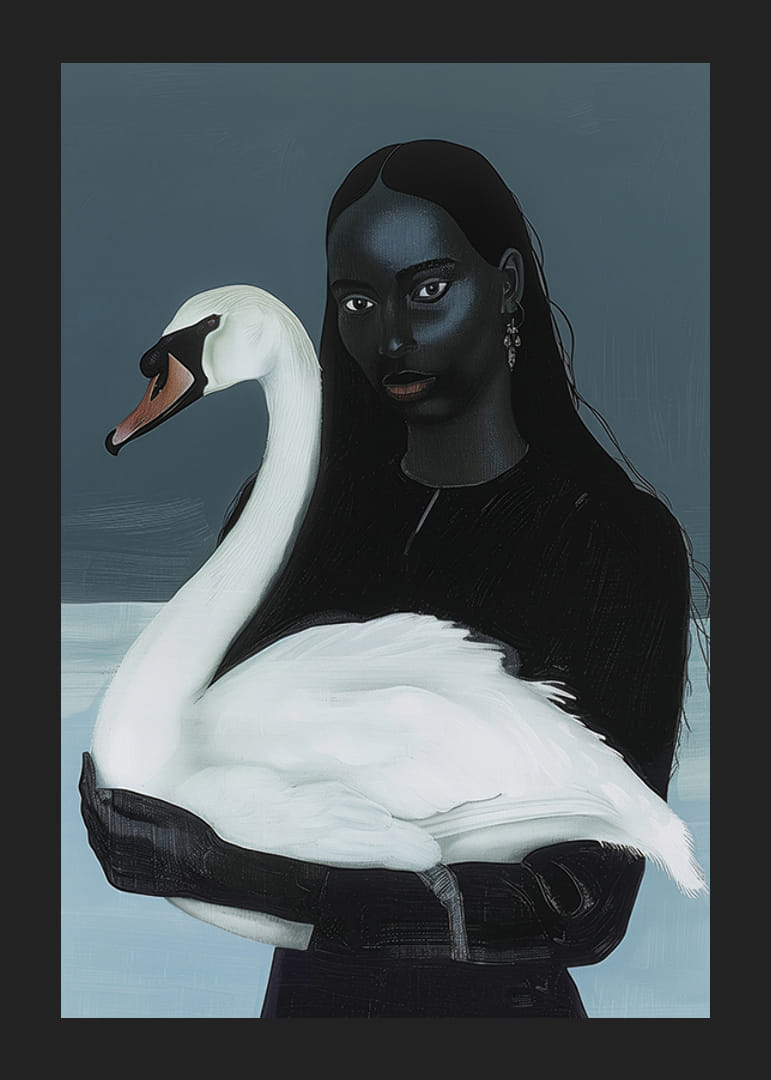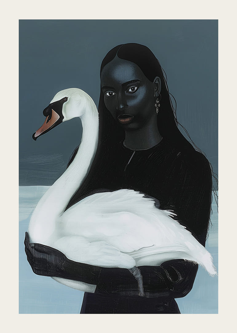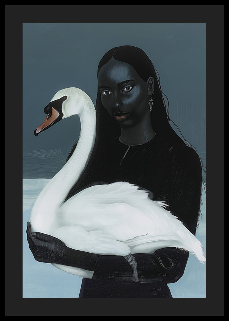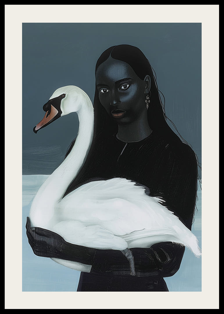 Denna poster fångar den tysta och djupa föreningen mellan kvinna och svan med en touch av mystik. De mörka tonerna och subtila kontrasterna skapar en atmosfär av drömsk elegans och harmoni.