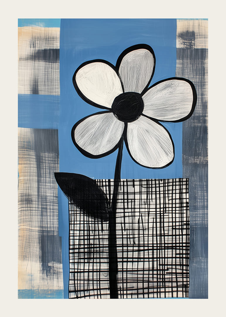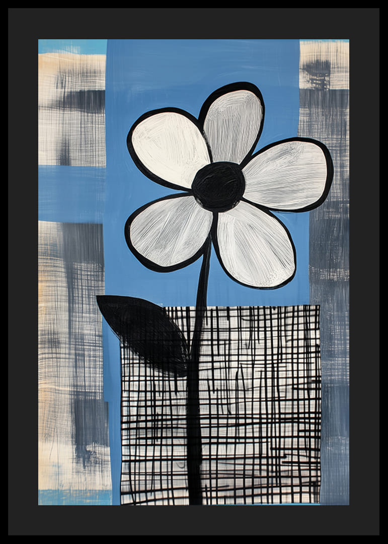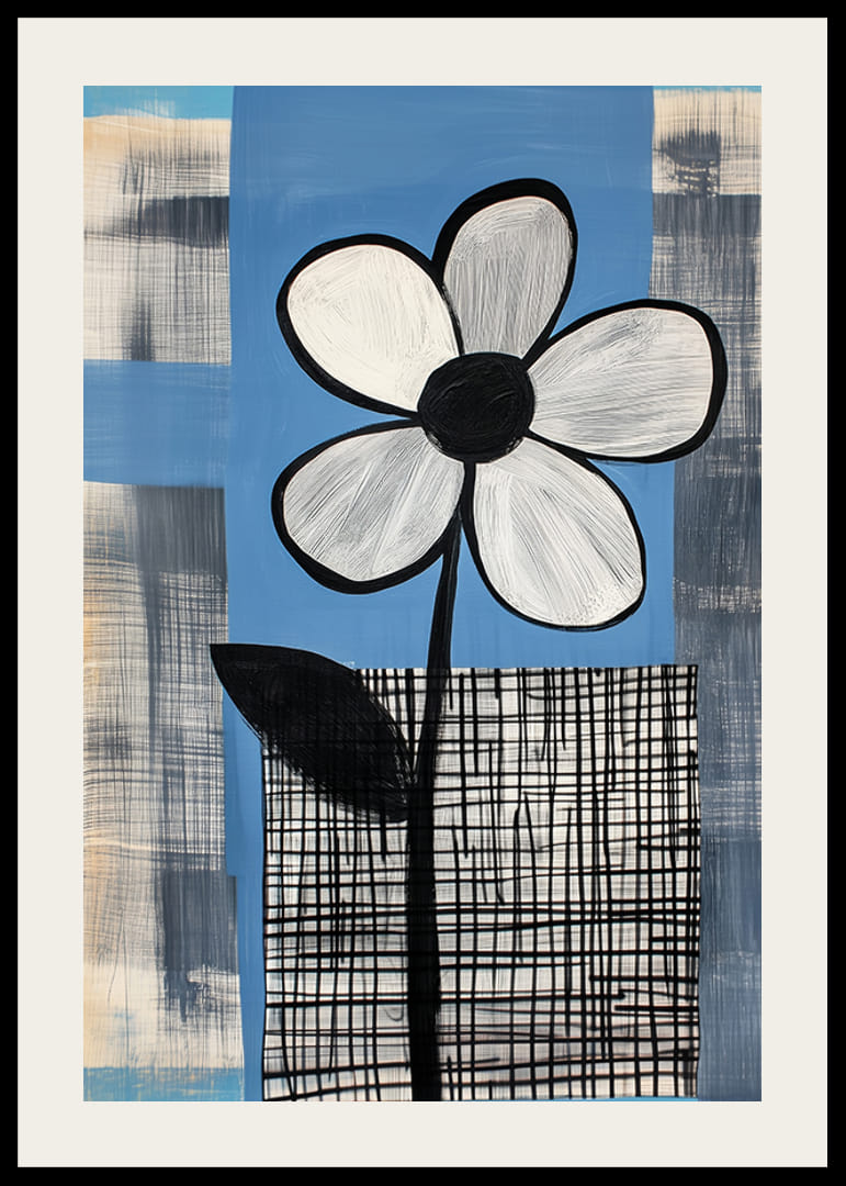 Denna poster fångar ögat med sin stilrena skönhet. En enkel, monokrom blomma står stolt mot en blå bakgrund, betonar struktur och form. De kontrasterande rutmönstren förstärker den konstnärliga enkelheten.
