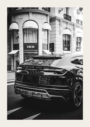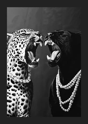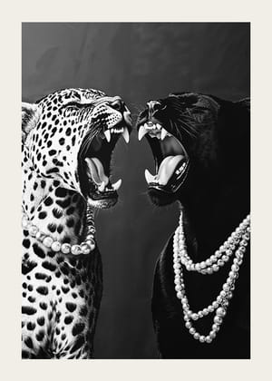 Två posters med distinkt elegans förenar djurisk styrka och urban sofistikering i en harmonisk balans som betonar kontrast och symmetri. Den första postern fångar en Lamborghini framför en Dior-butik, medan den andra två majestätiska rovdjur i en kraftfull pose, smyckade med eleganta pärlhalsband. Tavelväggen inger en känsla av lugn och styrka som lyfter rummet med sin stilrena skönhet och genomtänkta estetik.