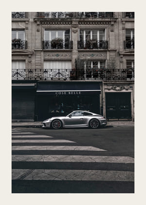 Dessa poster förmedlar en känsla av urban elegans med två svartvita fotografier av en Lamborghini och en Porsche 911. Bilden av bilen framför lyxiga butiker skapar en stark kontrast, förstärkande stadens sofistikation. Inramningen i trä bidrar till en modern och stilren känsla. Dessa posters ger en touch av tidlöshet och förhöjer atmosfären i vilket rum den än placeras.