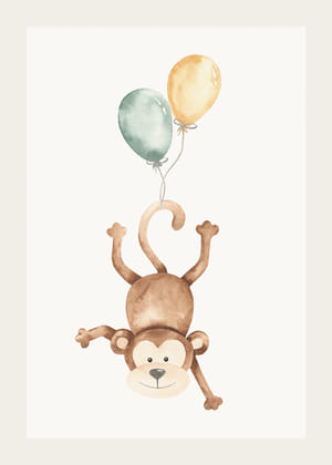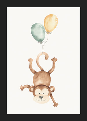 Mjuka pastelltoner och lekfulla motiv bildar en charmig tavelvägg där en apa och en giraff svävar med ballonger. Denna kombination av humor och lättsamhet sprider glädje och bekymmerslös energi. Tavlorna ger liv åt rummet genom sin balanserade placering och naturliga ljus, vilket skapar en perfekt balans mellan lekfullhet och stilfullhet.