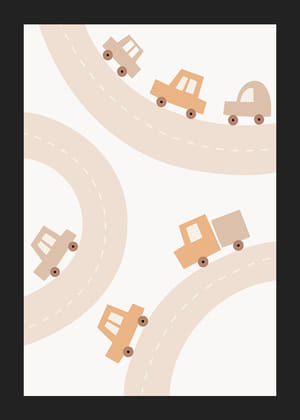 Tavelväggen utstrålar en mjuk och vänlig känsla där lekfulla fordon i dämpade jordtoner skapar en lugn rörelse över den ljusa ytan. Palettens subtila nyanser harmoniserar och skapar en visuell frid som fångar betraktarens intresse. Kombinationen av enkla former och mjuka kurvor bidrar till en inbjudande atmosfär som lyfter rummet med både elegans och lekfullhet.