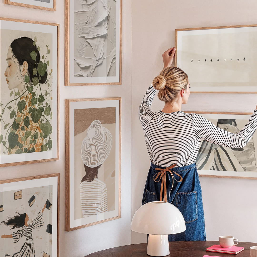 Denna tavelvägg utstrålar en känsla av lugn med sina noggrant arrangerade posters, där varje verk bidrar till en harmonisk helhet. Den dämpade färgpaletten av jordnära toner och subtila kontraster skapar en avkopplande atmosfär. Dessa posters motiv, från naturens mjuka konturer till människans eleganta former, förstärker känslan av balans och stillhet som förhöjer vilket rum som helst.