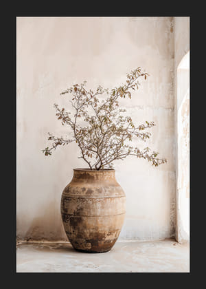 Låt dig förföras av dessa posters. Den vänstra illustrerar mjuka gardiner som dansar i solens varma sken, medan den högra visar en rustik vas med en delikat växt. Ljusa skuggor och naturliga toner skapar en känsla av stillhet. Perfekt för hemmet där du söker en harmonisk och avkopplande atmosfär. Med dessa posters förvandlas varje rum till en fridfull oas.